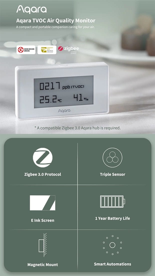 Bezprzewodowy sensor marki Aqara służy do dostarczania powiadomień o jakości powietrza, może wykryć stężenie i poziom LZO, a także temperaturę oraz wilgotność. Powiadamia o obecności TVOC: Total Volatile Organic Compounds, czyli cząsteczek lotnych związków organicznych szkodliwie oddziałujących na ludzki organizm. Związki te wydzielane są przez takie substancje jak farby czy detergenty, mogą więc znaleźć się w każdym gospodarstwie domowym narażając zdrowie domowników. Dzięki sygnalizatorowi AAQS-S01 zwiększysz bezpieczeństwo swoje i swojej rodziny.