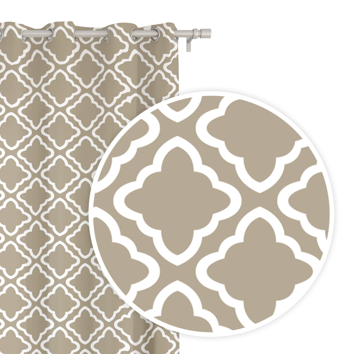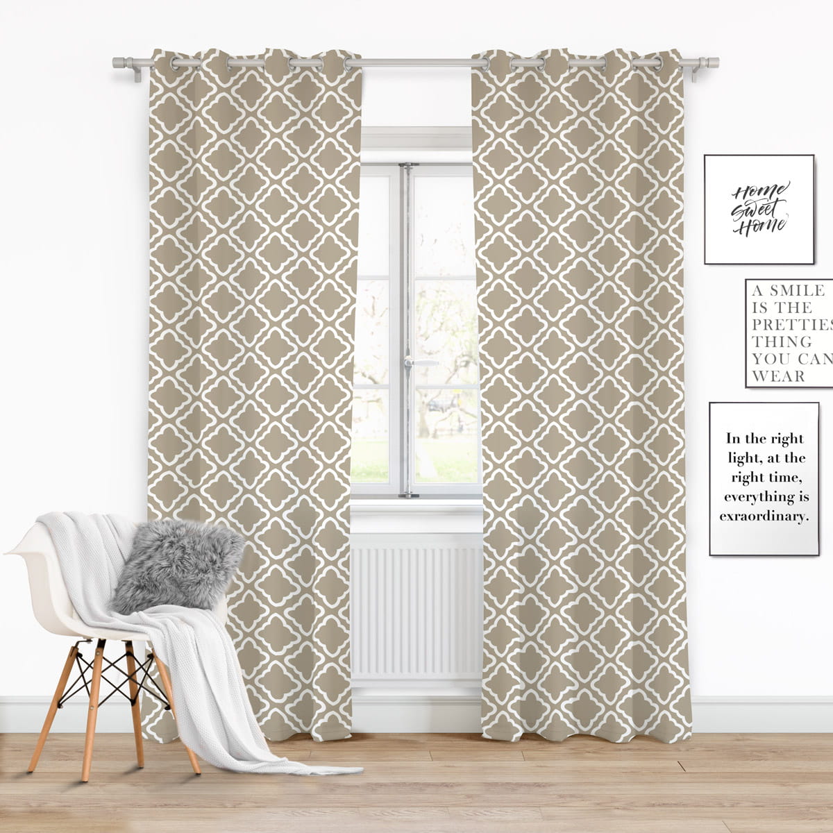Zasłona biało-beżowa doskonale wpasuje się do wnętrz w stylu skandynawskim, nowoczesnym. Na całej powierzchni posiada wzór marokański, który od kliku sezonów bije rekordy popularności. Mocuję się ją na karniszy za pomocą 8 chromowanych kółek o średnicy 4 cm. Taka konstrukcja sprawia, że zasłona układa się w estetyczne fale.