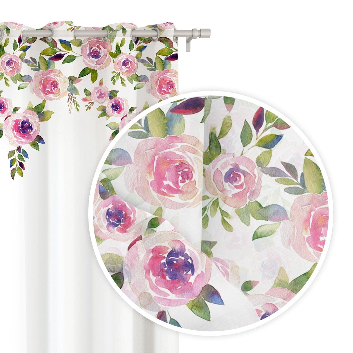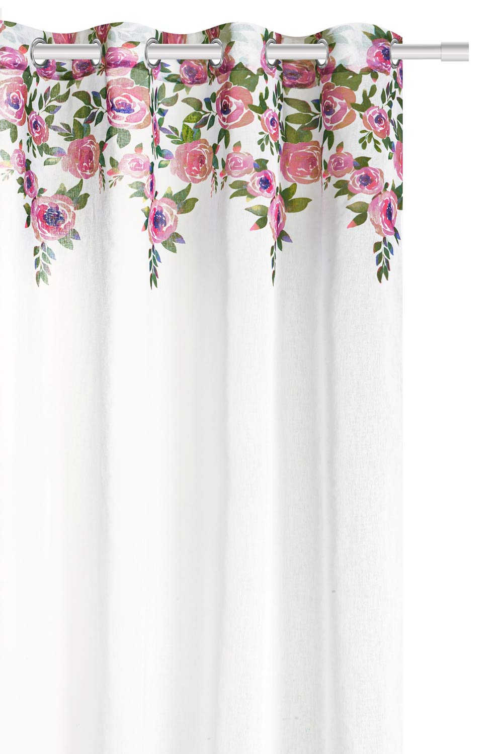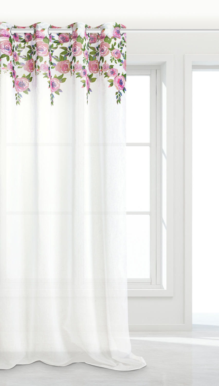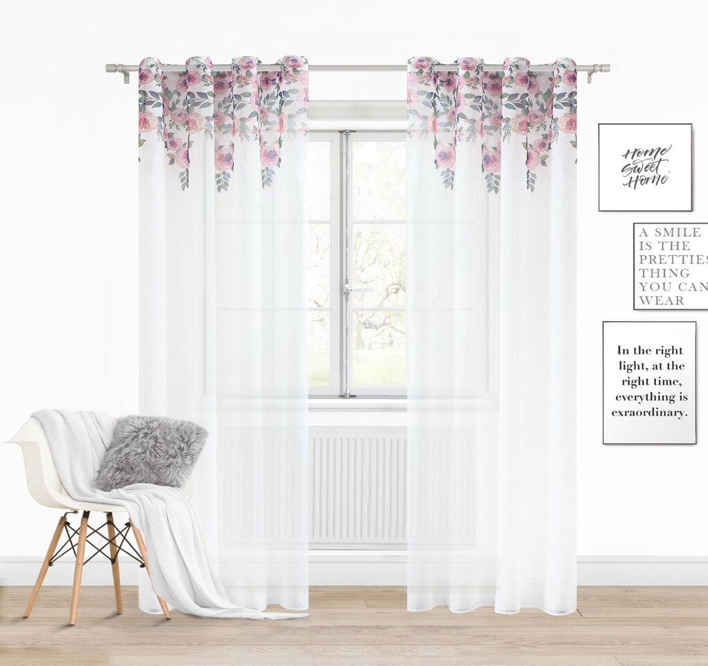 Zasłona biała doskonale wpasuje się do wnętrz w kobiecym stylu, a także młodzieżowym. Jest gładka, a na górze posiada przepiękny florystyczny wzór. Mocowana jest na 8 chromowanych przelotkach o średnicy 4 cm, które są bardzo proste w zawieszeniu na karnisz.