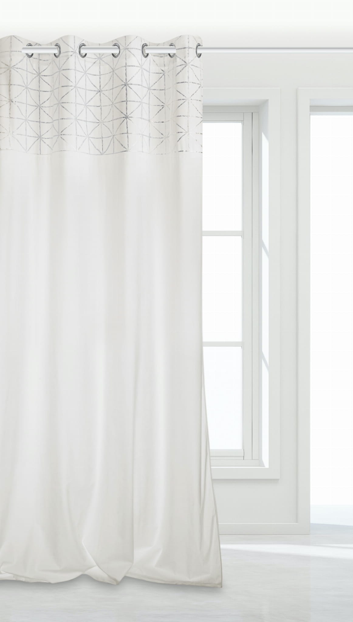 Zasłona Glossy w kolorze białym doskonale wpasuje się do nowoczesnych wnętrz. Mocowana jest na 8 chromowanych srebrnych przelotkach o średnicy 4 cm, które są bardzo proste w zawieszeniu na karnisz.