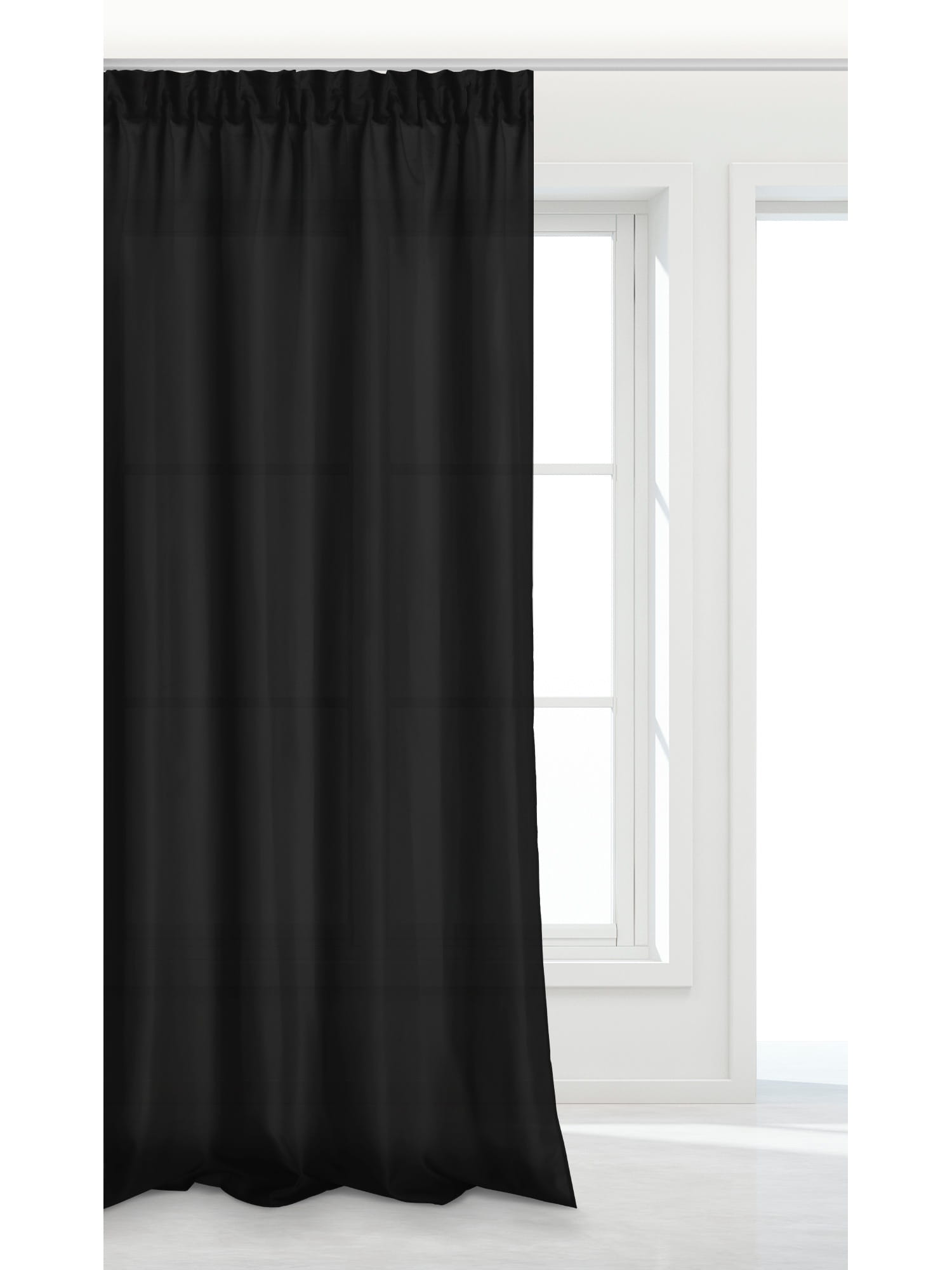 Zasłona czarna doskonale wpasuje się do wnętrz w stylu skandynawskim czy minimalistycznym. Mocuję się ją na karniszu za pomocą wszytej taśmy. Taka konstrukcja sprawia, że można zastosować dowolną gęstość marszczenia.