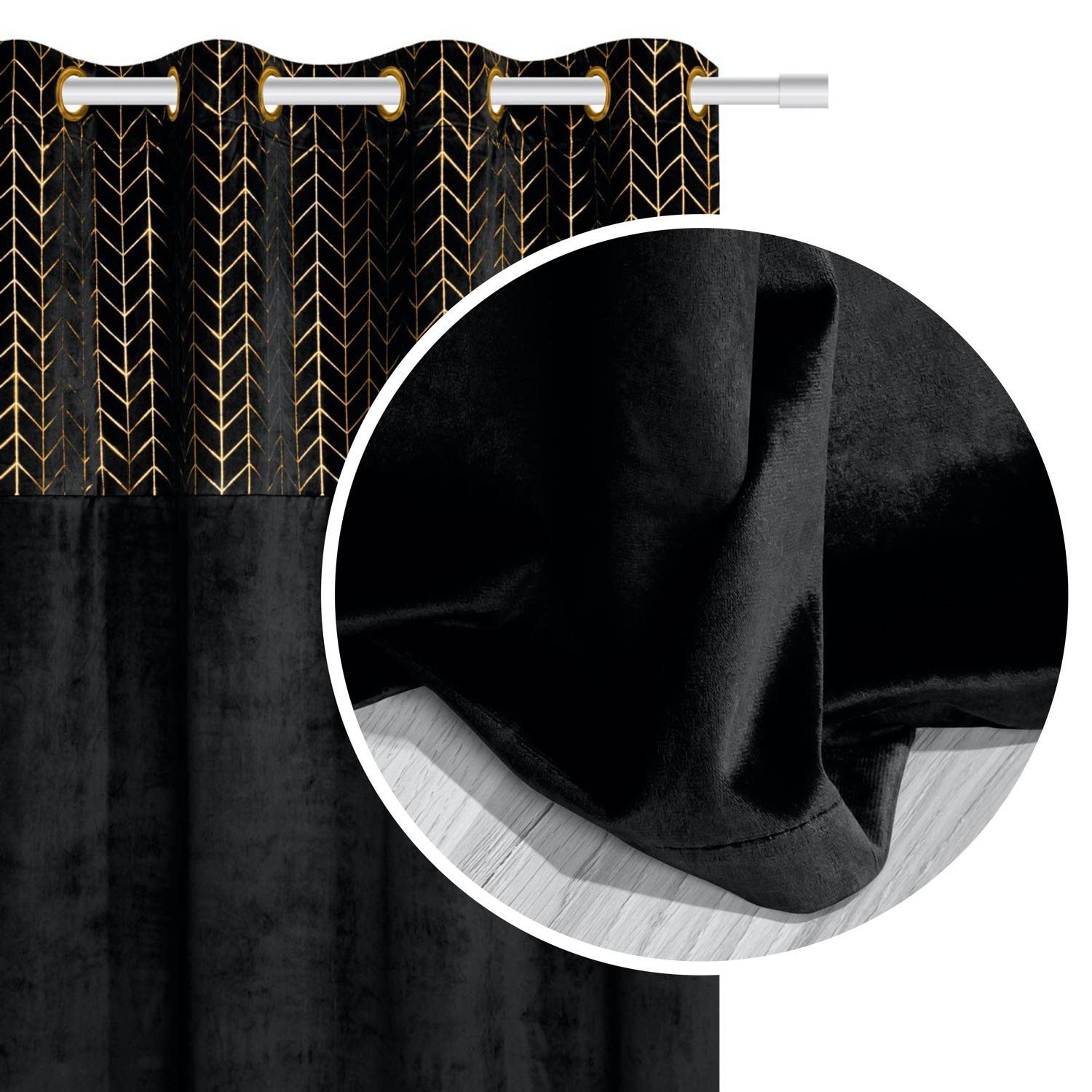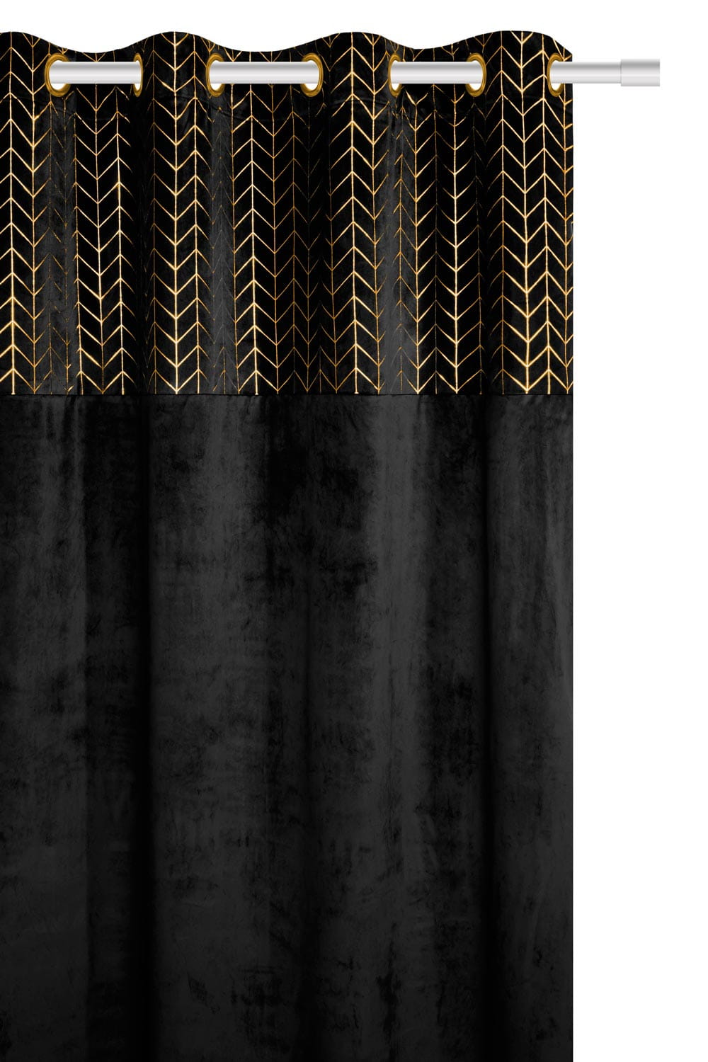 Zasłona welurowa z nadrukiem posiada uniwersalny rozmiar 140x250 cm, który pasuje do większości wnętrz. Jest bardzo elegancka, w górnej partii posiada złoty, skandynawski nadruk, który odda mnóstwa uroku dla Twojego domu. Wykonana została z tkaniny welurowej, która daje efekt półzaciemnienia pomieszczenia. Charakteryzuje się średnią grubością tkaniny. Jest bardzo przyjemna w dotyku.