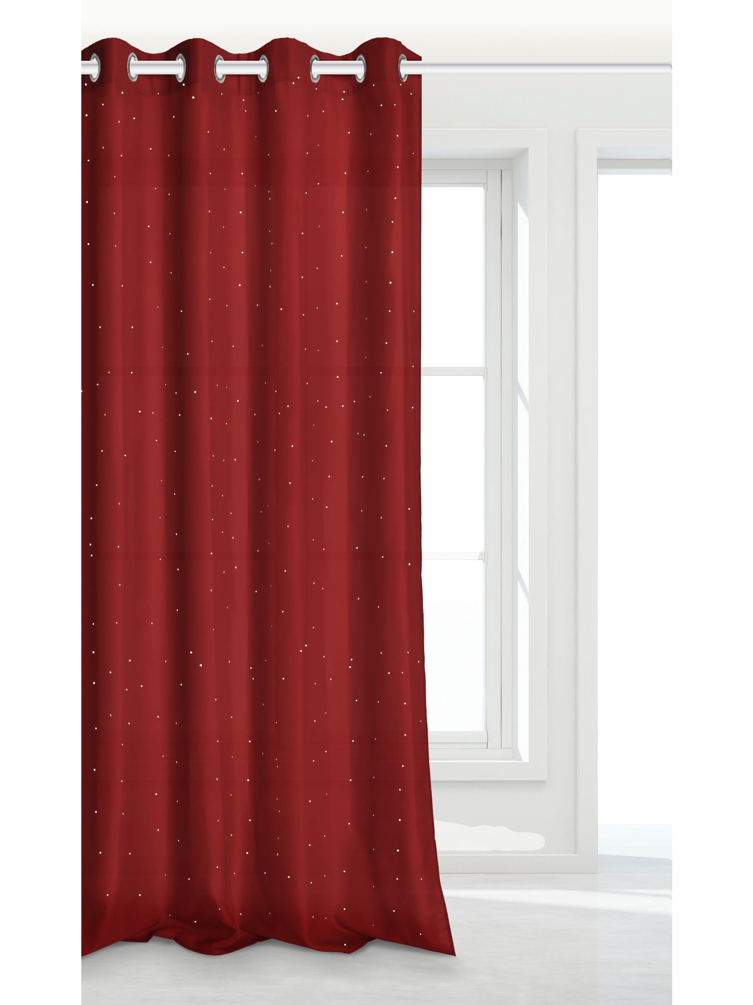 Zasłona czerwona doskonale wpasuje się do wnętrz w stylu glamour lub nowojorskim. Na całej powierzchni posiada efektowne zdobienia kryształkami a'la swarovski, które przepięknie mienią się na słońcu. Mocuję się ją na karniszy za pomocą 8 chromowanych kółek o średnicy 4 cm. Taka konstrukcja sprawia, że zasłona układa się w estetyczne fale.