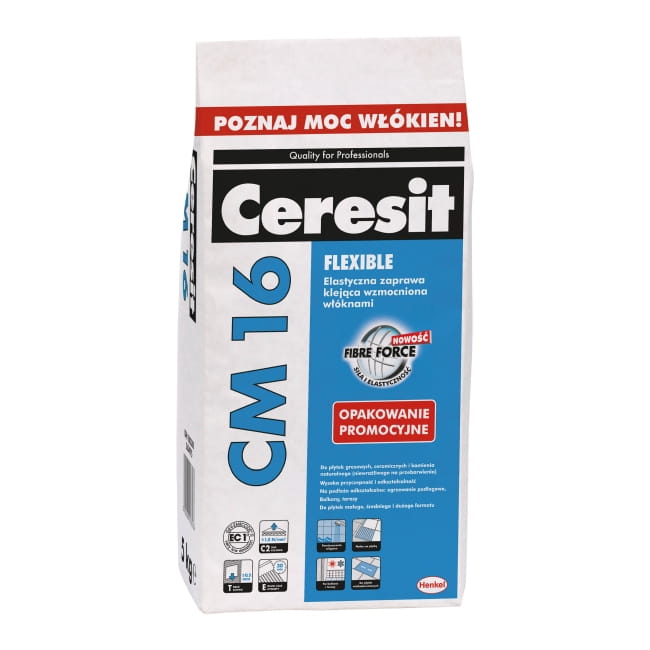 Elastyczna zaprawa klejąca Ceresit CM16 sprawdzi się wewnątrz i na zewnątrz budynku. Produkt posłuży Ci do mocowania płytek, na przykład gresu. Zaprawę zastosuj bez obaw na odkształcalnych powierzchniach. Przy pomocy preparatu ułożysz okładzinę podłogową na tarasie czy balkonie, ale też w pomieszczeniach, na przykład w korytarzu.