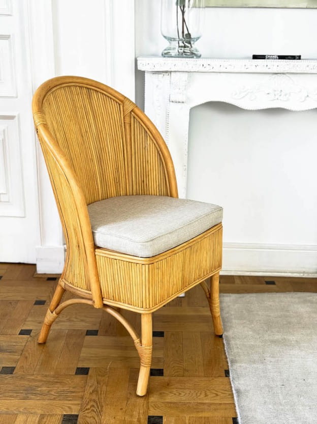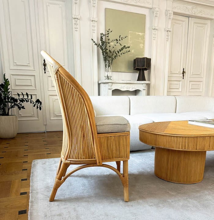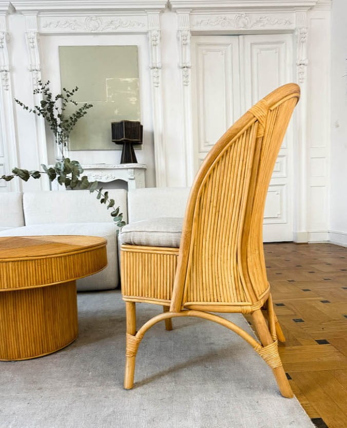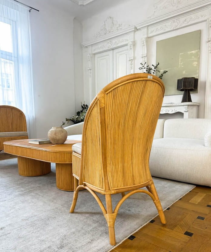 Wymiary: Szerokość: 52 cm Wysokość całkowita: 94 cm Wysokość do siedziska: 47 cm Głębokość siedziska: 45 cm Grubość poduszki: 6 cm Waga: około 17kg Materiał: Naturalny Rattan Wykonanie: Ręczne Kolor: Naturalny Przeznaczenie: salon, pokój, taras zadaszony, patio, altana, ogród zimowy, strefy relaksu, hotel Dodatkowo: Kremowa poduszkaFotel Rattanowy Tegal jest wykonany w 100% ręcznie z najwyższej jakości naturalnego rattanu w Indonezji. Solidne wykonanie oraz opływowy kształt zapewnią wysoki poziom bezpieczeństwa i komfortu. Meble rattanowe nie wymagają specjalnych czynności pielęgnacyjnych można je łatwo czyścić ściereczką z delikatnym środkiem czyszczącym. Przeznaczone są do użytku wewnętrznego i zewnętrznego, ale pod zadaszeniem, aby uniknąć zasinień i odbarwień materiału. Zalecamy unikanie długotrwałej ekspozycji na intensywne promieniowanie UV oraz przechowywanie mebli zimą na zewnątrz, ponieważ naturalny rattan jest wrażliwy na niskie temperatury. Umieszczaj meble w miejscach osłoniętych przed bezpośrednim słońcem lub korzystaj z parasoli przeciwsłonecznych.