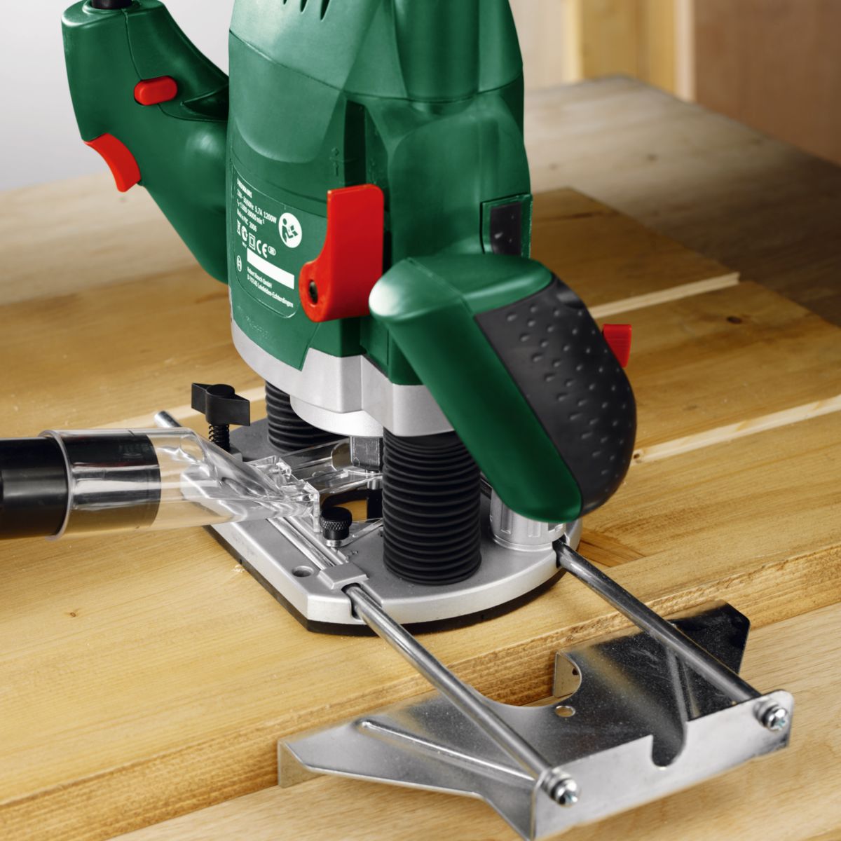 - Akcesoria : adapter do odsysania pyłu, klucz widełkowy, bolec kopiujący, frez rowkowy (średnica 8 mm), prowadnica równoległa, zaciski mocujące (3 szt.), trzpień centrujący