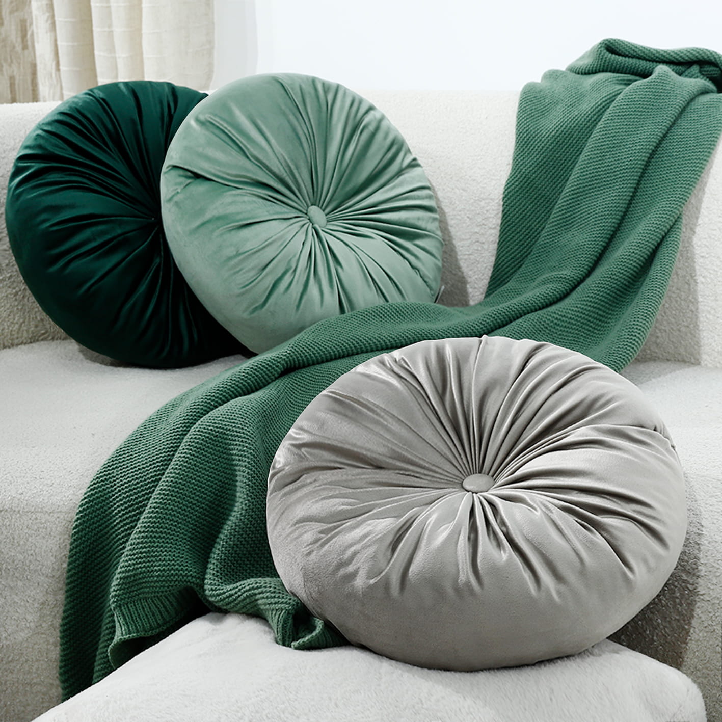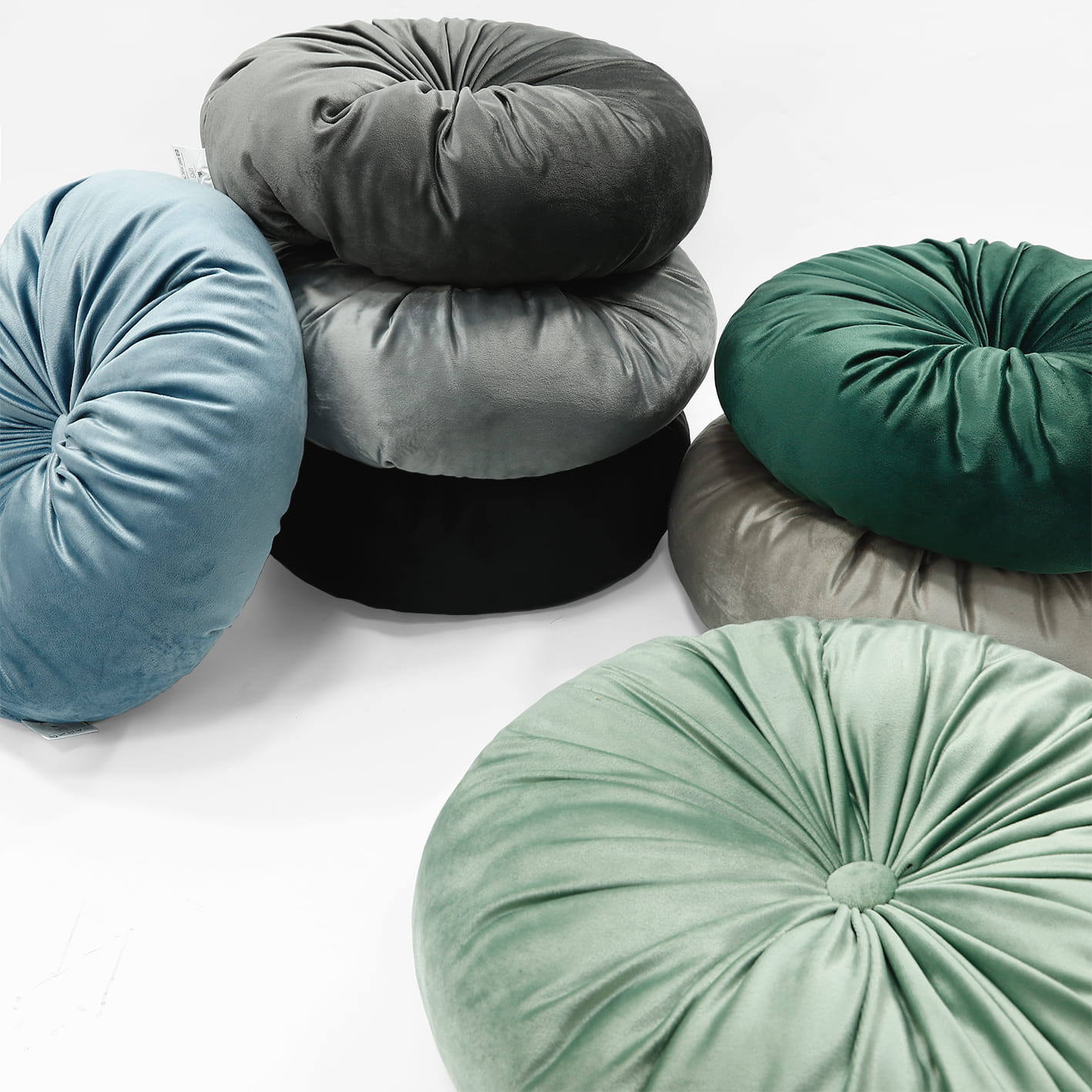 Nowoczesna okrągła poduszka pochodzi z linii Soft, cechuje się delikatną tkaniną i niezwykle przyjemnym w dotyku aksamitem. Na środku ozdobiona jest guzikiem w kolorze materiału.