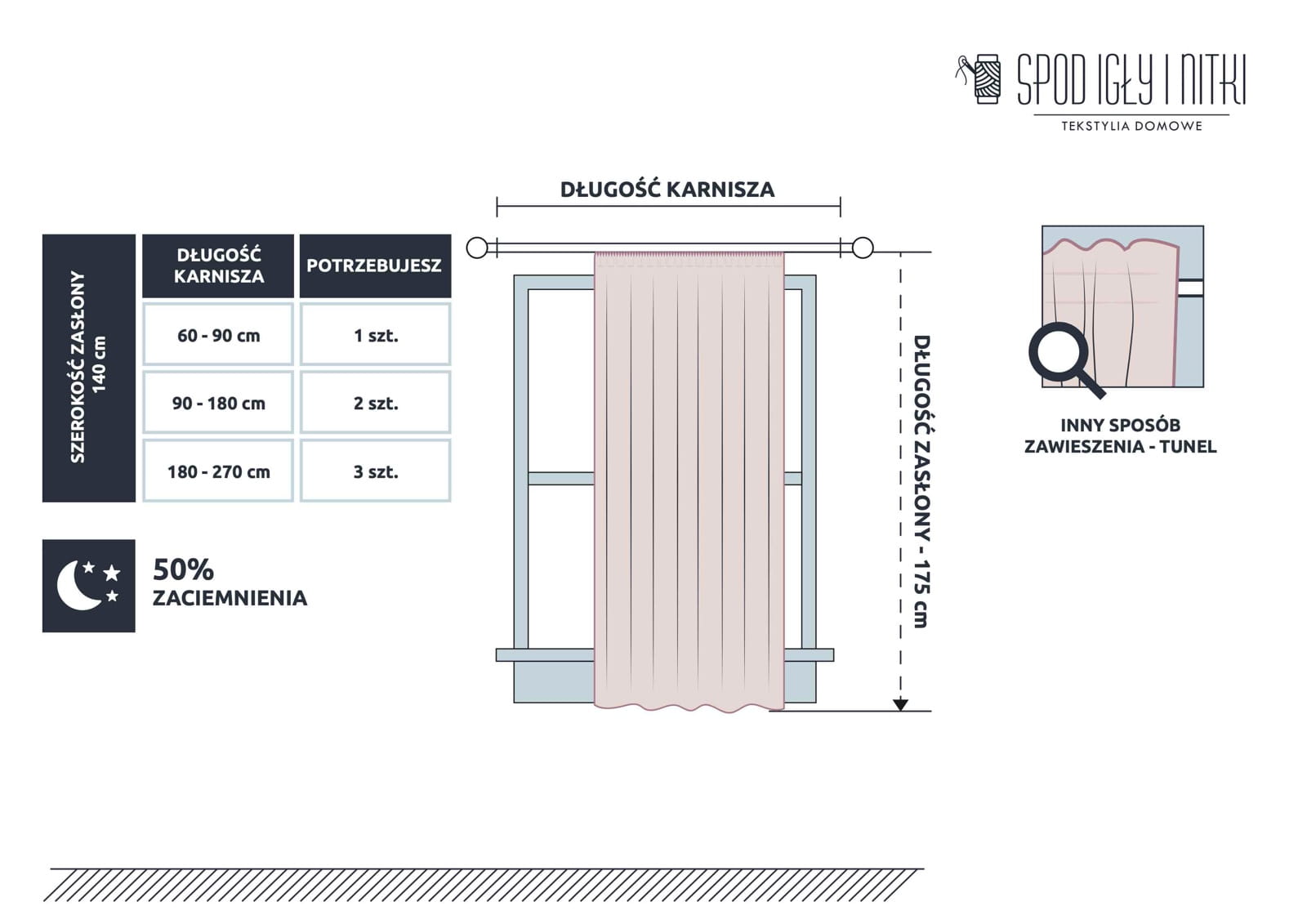 Zasłona doskonale wpasuje się do wnętrz w stylu skandynawskim czy minimalistycznym. Mocuje się ją na karniszu za pomocą wszytej taśmy. Taka konstrukcja sprawia, że można zastosować dowolną gęstość marszczenia.