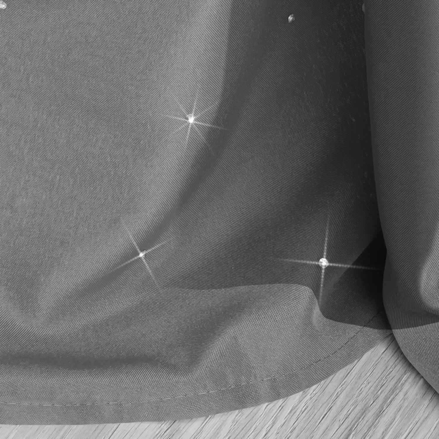 Zasłona grafitowa doskonale wpasuje się do wnętrz w stylu glamour lub nowojorskim. Na całej powierzchni posiada efektowne zdobienia kryształkami a'la swarovski, które przepięknie mienią się na słońcu. Można ją zamocować zarówno na żabkach, ale także za pomocą 4 cm tunelu. Taka konstrukcja sprawia, że zasłona układa bardzo estetycznie.