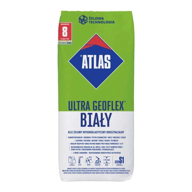 Klej do płytek Atlas Geoflex Ultra biały ma uniwersalne zastosowanie. Może być używany na zewnątrz i wewnątrz budynków do klejenia płytek. Produkt ten wyróżnia się idealnym rozpływem i brakiem spływu. Nadaje się również do płytek dużego formatu. Klej może być używany wraz z trudnymi podłożami. Schnie szybko. Już po dwunastu godzinach można wchodzić na płytki.
