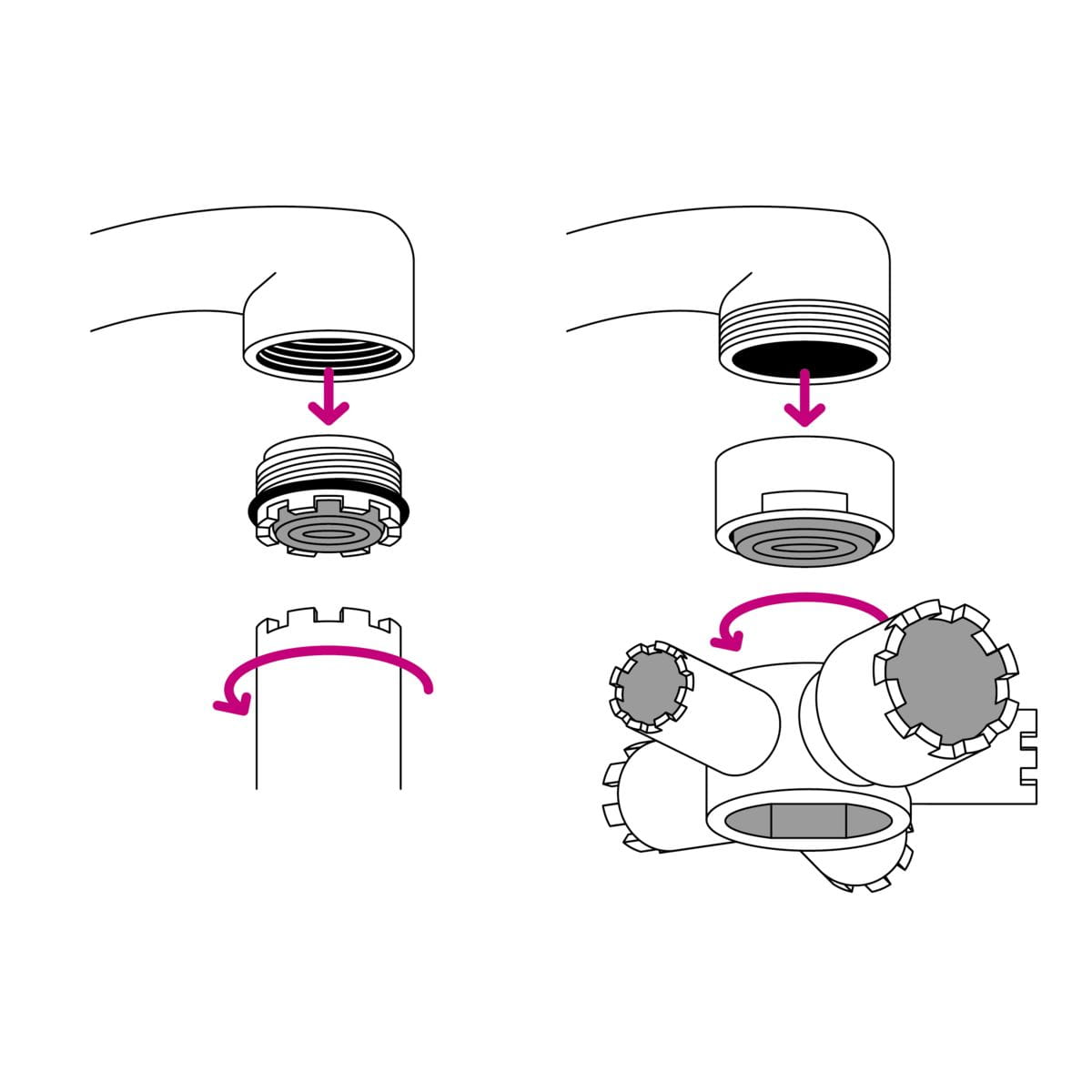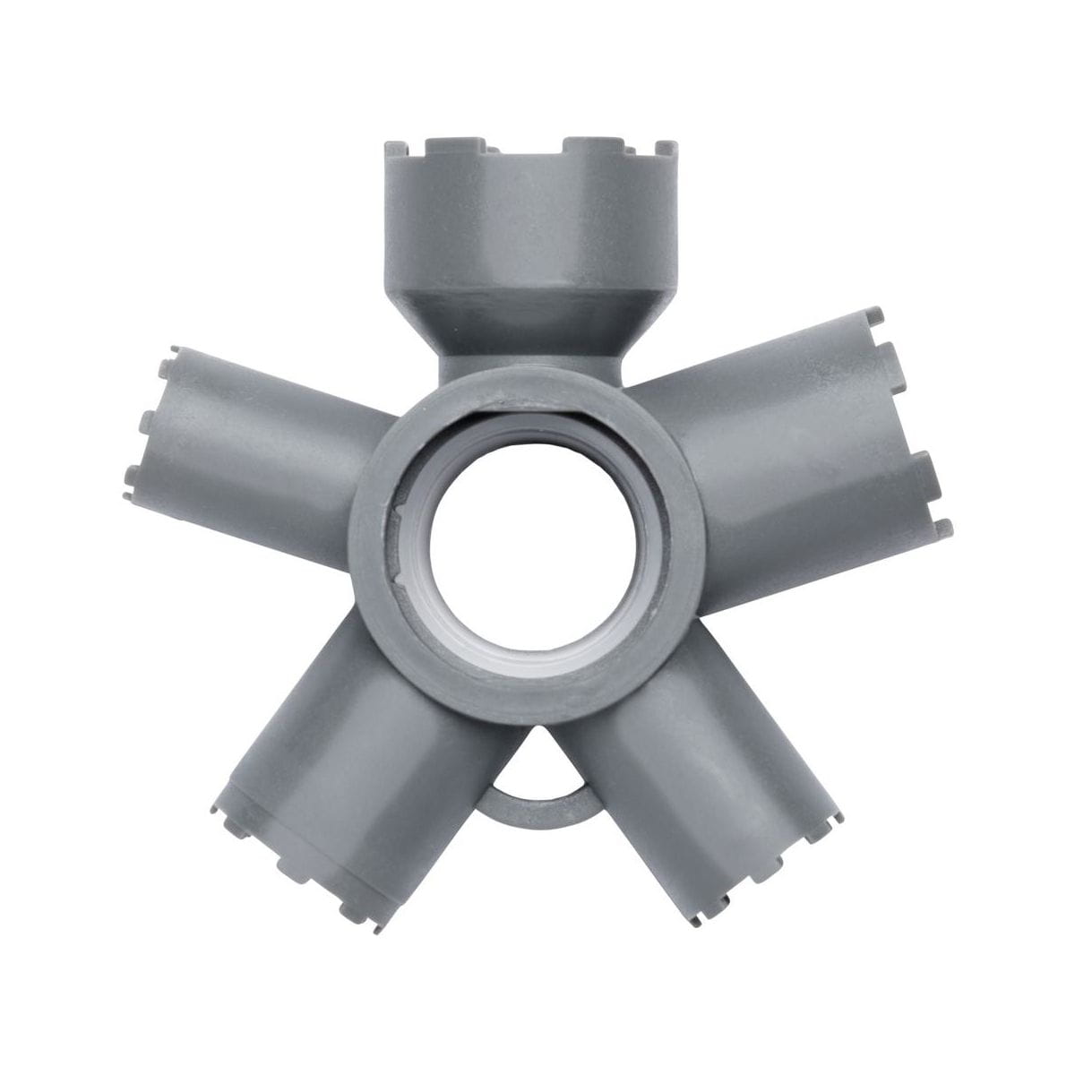 Uniwersalny klucz służący do montażu i demontażu wszystkich perlatorów, aeratorów i pierścieni w armaturze łazienkowej i kuchennej, niezależnie od marki czy modelu. Część środkowa jest przeznaczona na pierścienie a 5 odgałęzień umożliwia zastosowanie w różnych rozmiarach i typach aeratorów.