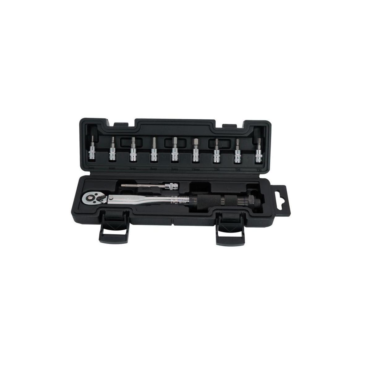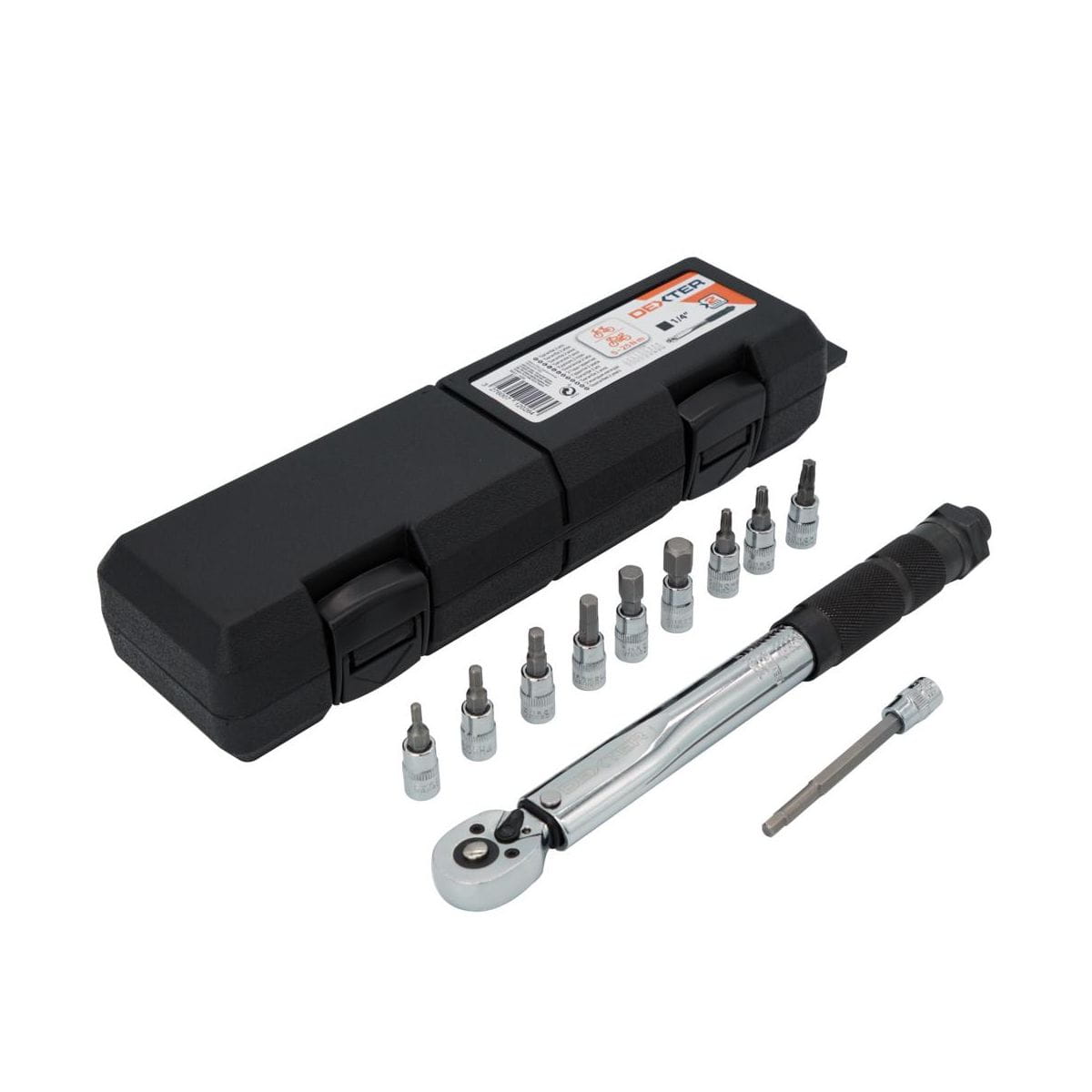 Klucz dynamometryczny Dexter z kwadratowym trzpieniem 1/4", idealny do prac przy motocyklach lub rowerach wymagających precyzyjnego momentu obrotowego (do 25 Nm). Moment dokręcania można łatwo regulować przy pomocy rękojeści (0-25 Nm). Sprzedawany z 10 akcesoriami zapewniającymi precyzję i wszechstronność zastosowań. Umożliwia szybkie i łatwe dokręcanie części i akcesoriów do żądanego momentu obrotowego. Stal chromowo - wanadowa z której wykonano narzędzie zapewnia trwałość i wytrzymałość klucza.
