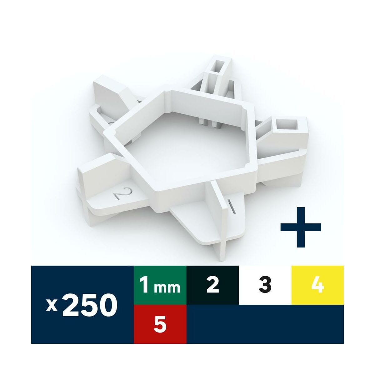 Wszechstronny krzyżyk wielokrotnego użytku w kształcie litery „X” nadaje się zarówno do układania płytek prostych, jak i ukośnych. Mnogość końcówek umożliwia uzyskanie różnych szerokość fugi, od 1 do 5 mm, co pozwala na zastosowanie go do płytek o różnych wymiarach i w różnych miejscach. Wykonany w 97% z plastiku pochodzącego z recyklingu. W celu uniknięcia poślizgu zaleca się pozostawienie krzyżyków w spoinach na ścianie do czasu wyschnięcia kleju. Opakowanie zawiera 250 elementów dystansowych. Kompatybilność z zestawem samopoziomującym, pozwala uzyskać optymalny wynik.