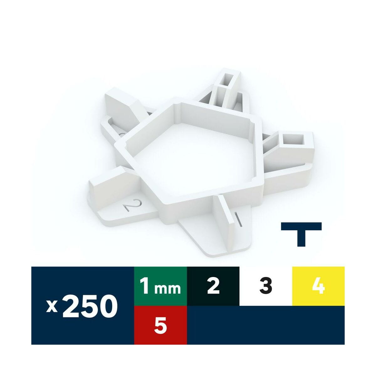 Wykonane w 97% z przetworzonego plastiku, krzyżyki wielokrotnego użytku w kształcie litery „T” umożliwiają tworzenie połączeń krzyżowych, doczołowych oraz w jodełkę. Pozwalają na montaż podłogowy lub ścienny - zaprojektowane tak, aby ułatwić układanie dużych płytek dzięki ich gałęziom o różnych rozmiarach, od 1 do 5 mm. W celu uniknięcia poślizgu zaleca się pozostawienie ich w spoinach ścian do czasu wyschnięcia. Zestaw zawiera 250 elementów dystansowych Kompatybilność z zestawem samopoziomującym, pozwala uzyskać optymalny wynik.