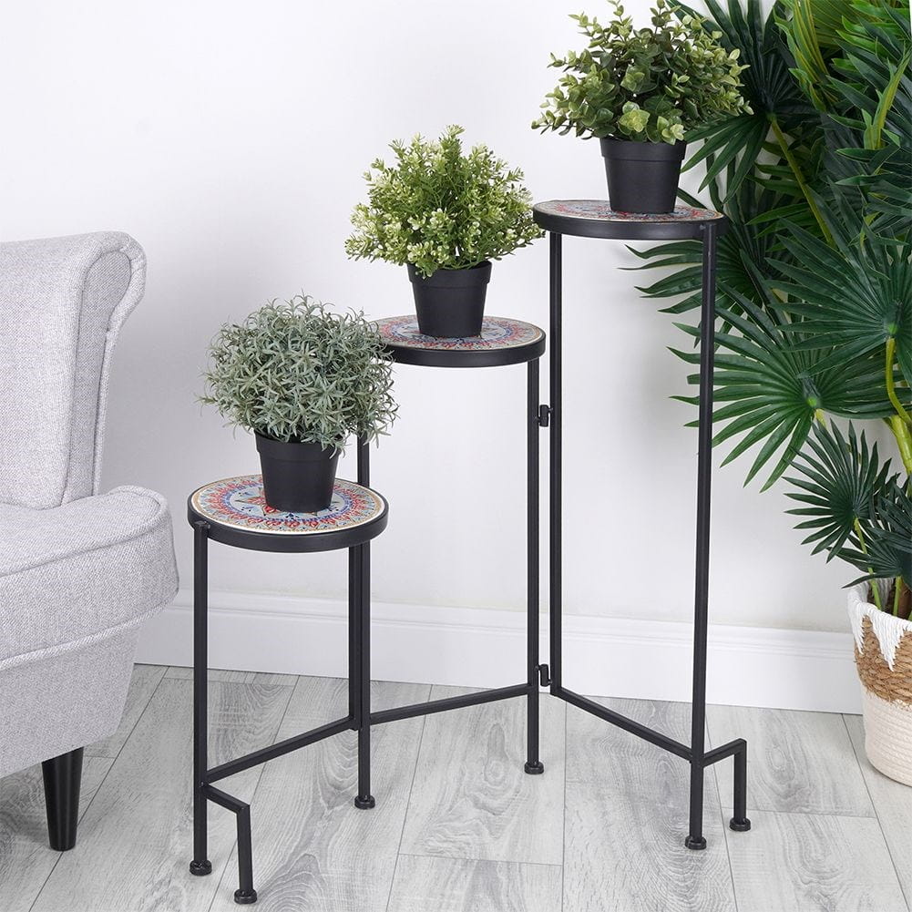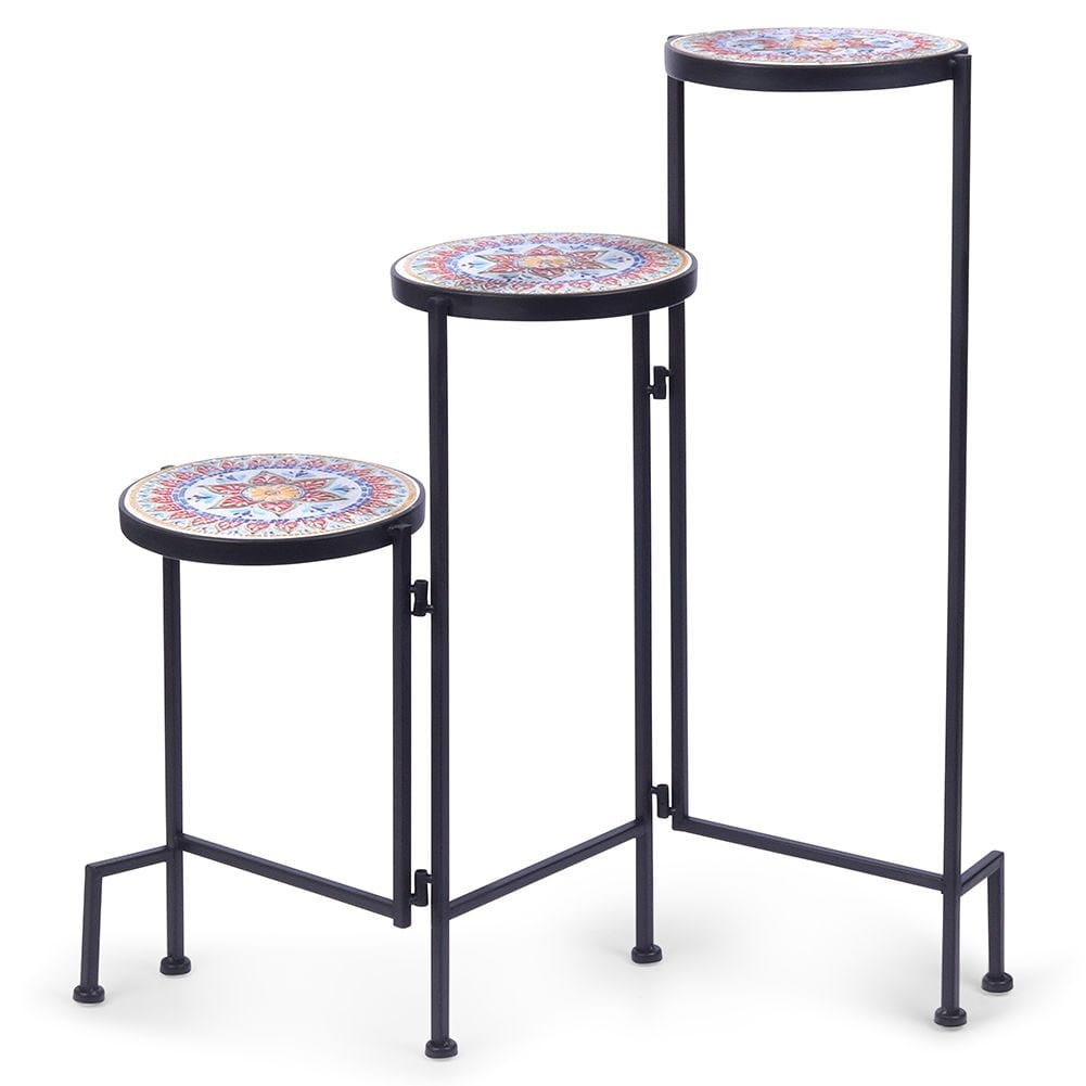 Metalowy, czarny kwietnik 3-poziomowy na kwiaty lub rośliny, posiada blaty wykonane z ceramiki z efektownym dekorem. Idealny do domu, ale również na balkon czy taras.✅Dane techniczne: