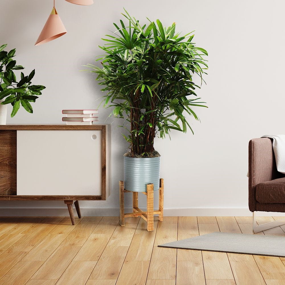 Kwietnik osłonka doniczka metalowa na drewnianym stojaku 50 cm na rośliny kwiaty