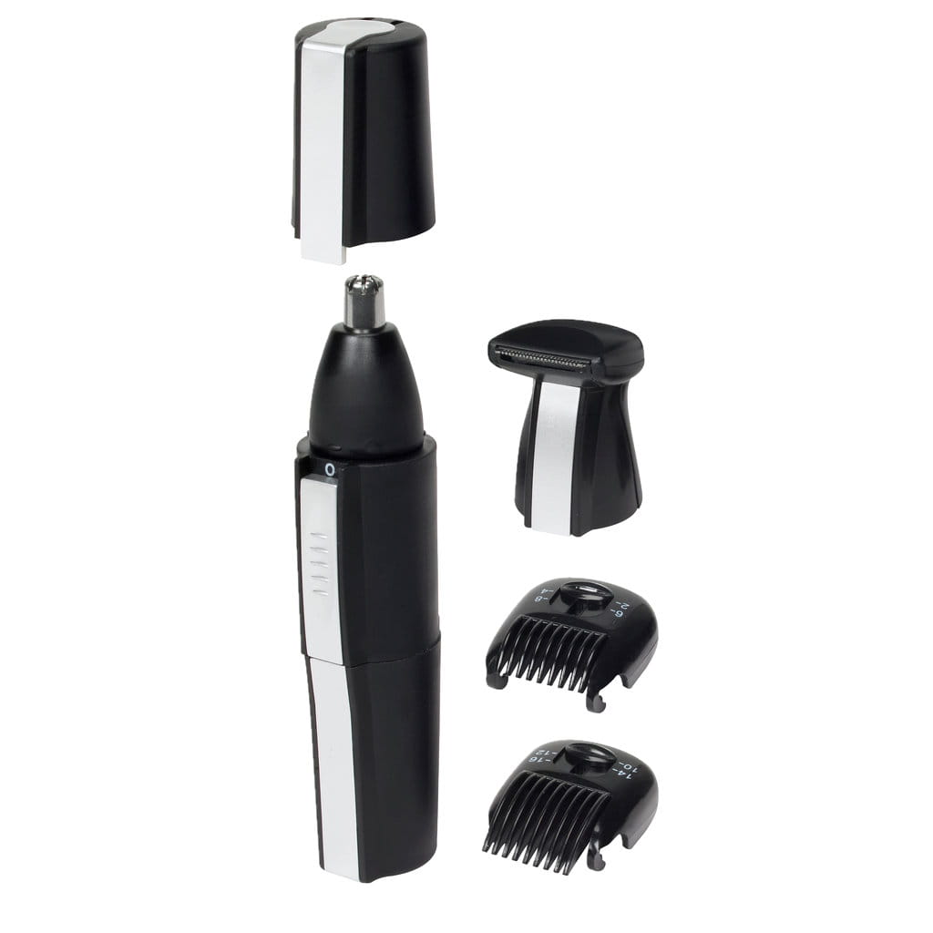 Trymer z wymiennymi końcówkami dostosowanymi do brwi, bokobrodów i włosków w nosie. W zestawie grzebień i szczoteczka do czyszczenia. Zasilany 1 baterią AA (do kupienia osobno).