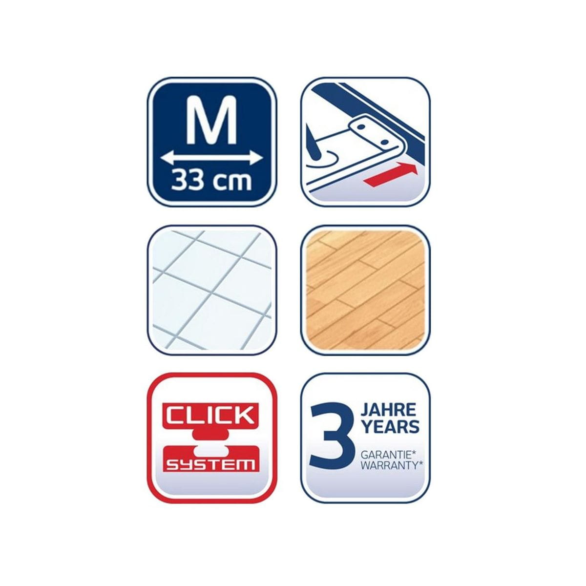 Mop Combi M z nakładką micro duo o długości 33 cm przeznaczony jest do czyszczenia wszystkich rodzajów powierzchni. Jego innowacyjna konstrukcja pozwala szybko i skutecznie czyścić podłogi. Mop Combi M z nakładką micro duo powstał po to, by ułatwić codzienne sprzątanie. Szerokość mopa to 33 cm, co w zupełności wystarcza do czyszczenia średnich i większych przestrzeni. Mop posiada łatwą do wymiany nakładkę micro duo (przeznaczoną do czyszczenia wszystkich rodzajów powierzchni). Ponieważ nakładka zachodzi na brzegi mopa, można jednocześnie umyć krawędzie i narożniki. Można ją prać w pralce w temperaturze 60 °C. Mop jest ponadto wyjątkowo wygodny i bez problemu dociera do wielu zakamarków. Jest to możliwe dzięki zastosowaniu obrotowego profesjonalnego przegubu 360°. Stalowy drążek ma długość 140 cm i wyposażony jest w system Click marki Leifheit. Można go używać ze wszystkimi urządzeniami czyszczącymi Leifheit. System Click umożliwia wykorzystanie jednego drążka do wielu zadań dzięki temu, że pasuje on do innych akcesoriów Leifheit (szczotek, ściągaczek, myjek do szyb i kafelków itp.). Mop Combi M z nakładką micro duo objęty jest 3-letnią gwarancją.