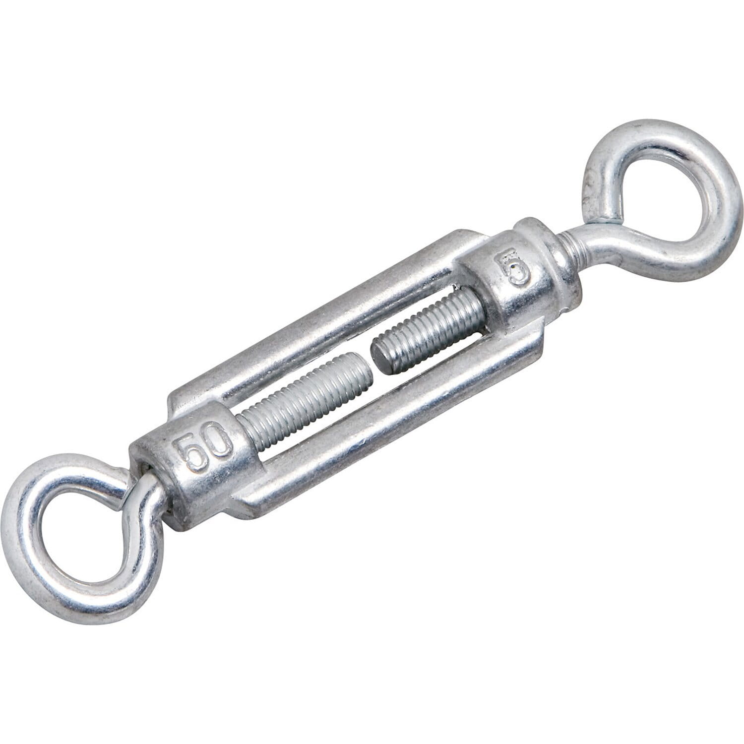 Napinacz marki LUX-TOOLS do napinania lin. Wykonany z ocynkowanej stali. Wersja ucho/ucho, rozmiar M 5 x 50 mm.