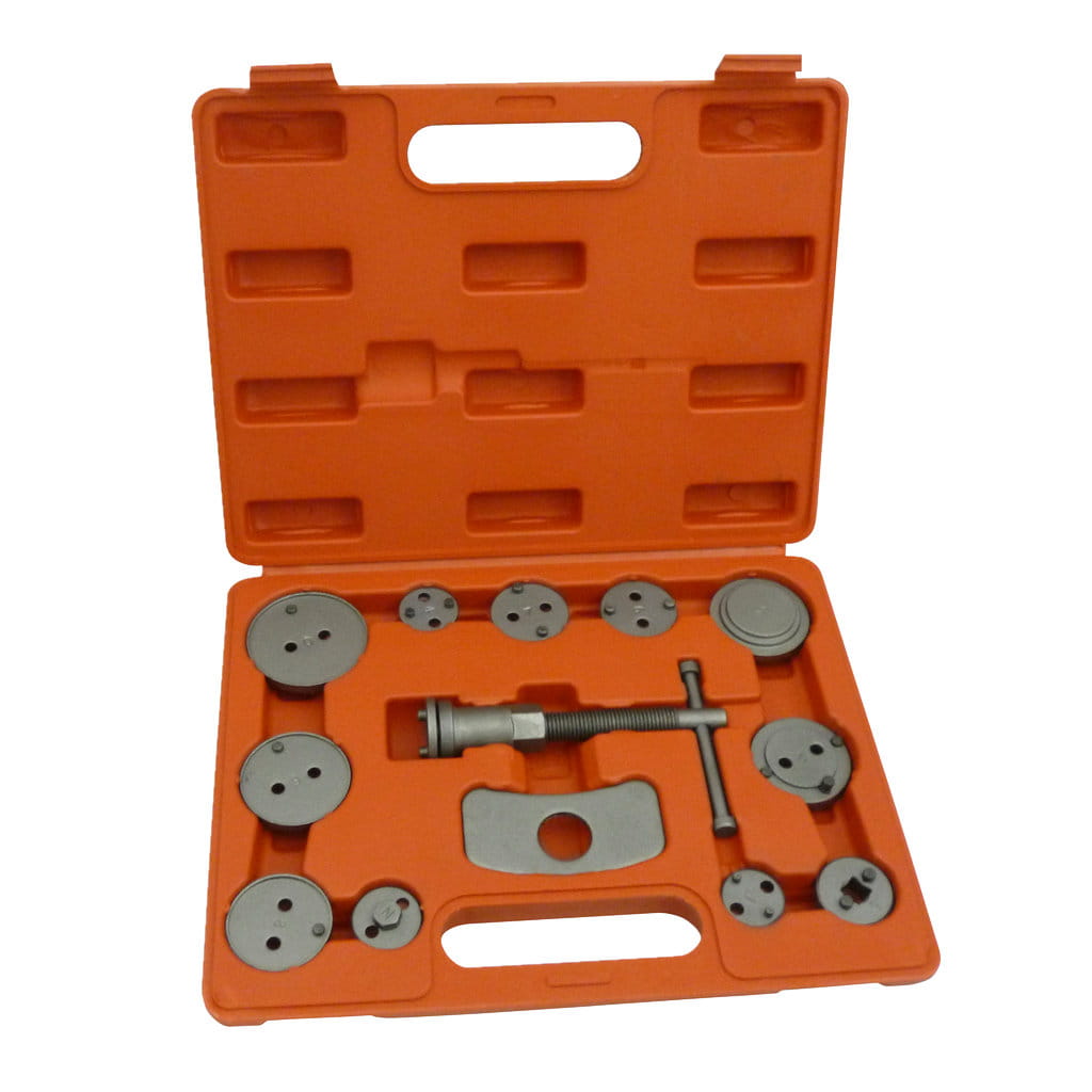 Pomysłowy zestaw narzędzi pomocnych do wciskania tłoczków hamulcowych w większości modeli samochodów (BMW, Ford, Citroen, Mitsubishi, Nissan, Audi, Honda, Mercedes, Mazda, SAAB, Subaru, VW, Opel).