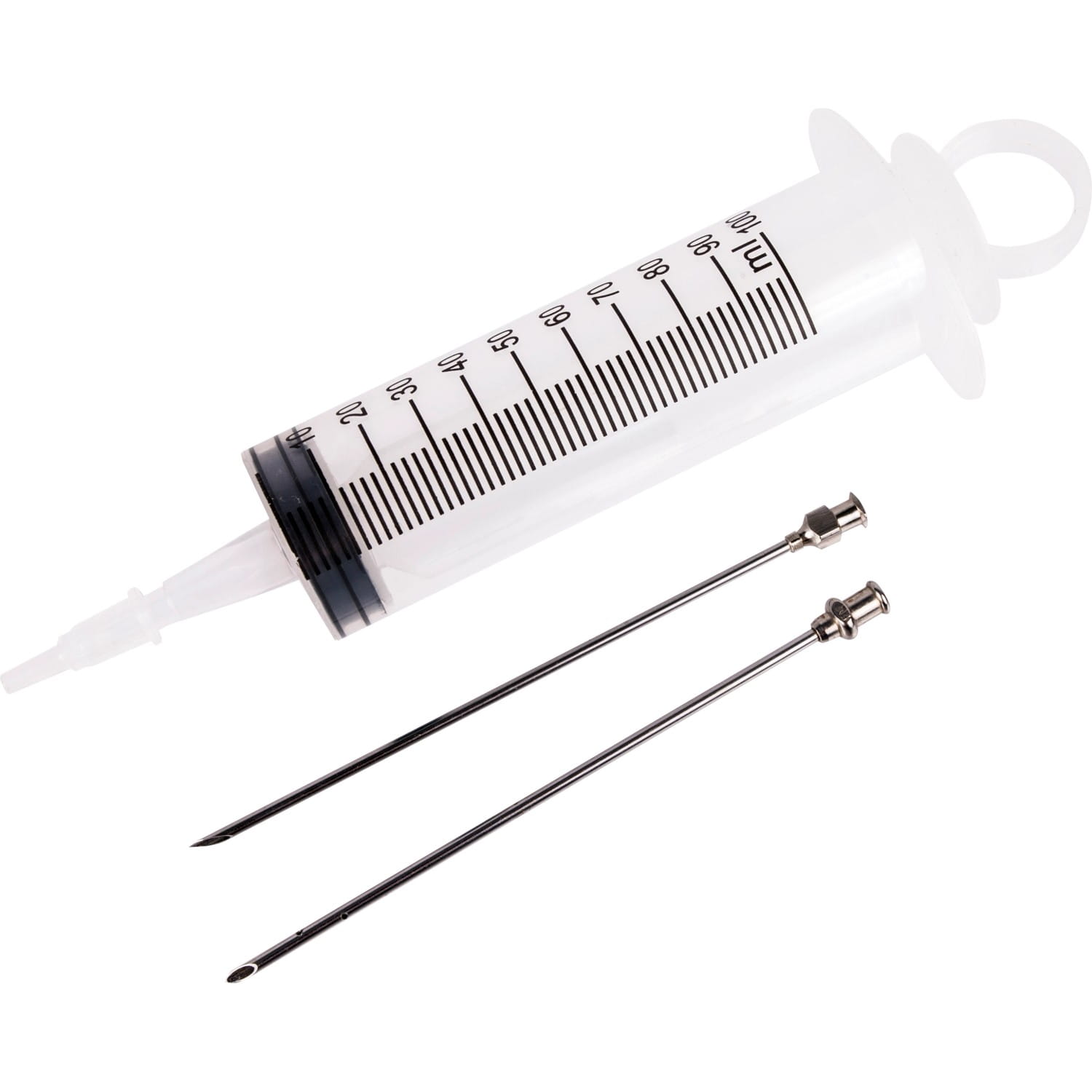 Strzykawka wielokrotnego użytku, wykonana z elastycznego plastiku.Przeznaczona do nastrzykiwania mięs.
