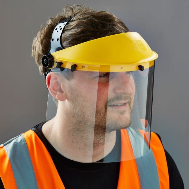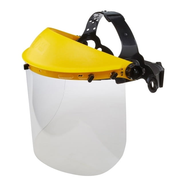 Ochraniacz na twarz w postaci przezroczystej przyłbicy dobrze chroni oczy, twarz i szyję. Zabezpiecza je przed odłamkami obrabianych materiałów oraz rozbryzgami cieczy. Szybka z poliwęglanu jest trwała, a dodatkowo nie ogranicza widoczności. Maskę można regulować, dopasowując ją do obwodu głowy. Dostępne są również przyłbice w postaci siatki.