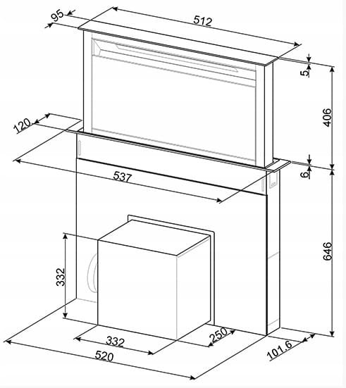 Okap do zabudowy w blacie, szerokość: 12 cm, długość: 53,7 cm, 4 prędkości pracy silnika + tryb intensywny, maksymalna wydajność: 570 m³/h, oświetlenie LED