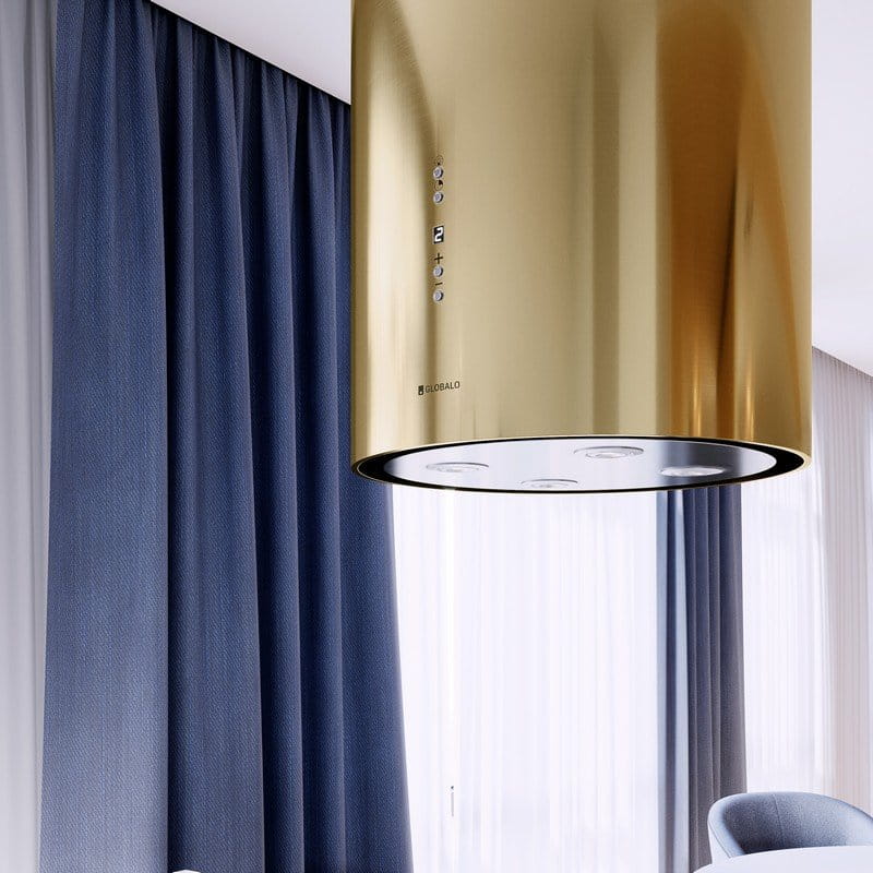 klasa energetyczna B, wyspowy, szer. 39 cm, sterowanie klawiszami Soft-Touch, zakres prędkości: 3 biegi + boost, wydajność max. 742 m3/h, głośność min. 46 dB, wykonanie: stal szlachetna lakierowana na kolor złoty, oświetlenie POWER LED 4 x 2 W. Linia GLOBALO Exclusive Kolor złoty (realizacje) Złoty kolor okapu w zależności od barwy i intensywności oświetlenia w kuchni może przybierać różny odcień złota. Obydwie okrągłe maskownice (górna i dolna część) są malowane w tym samym czasie i tym samym kolorem. Górna maskownica posiada mniejszą średnicę niż dolna część okapu, co może powodować inne odbicie światła i dawać złudzenie innego odcienia koloru. Zalety i korzyści dla użytkownika okapu Cylindro Isola 39.6 Light Gold Cylindryczny okap wyspowy to efektowne urządzenie, dzięki któremu wyspa kuchenna będzie nie tylko ozdobą pomieszczenia, ale również komfortową powierzchnią roboczą, znakomicie przystosowaną do przygotowywania posiłków.✅Dane szczegółowe: