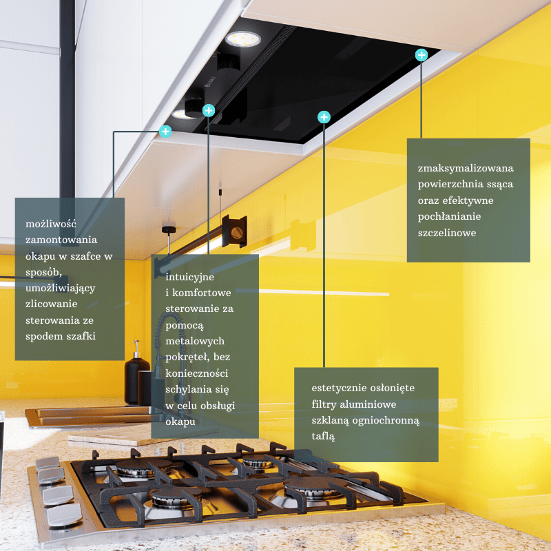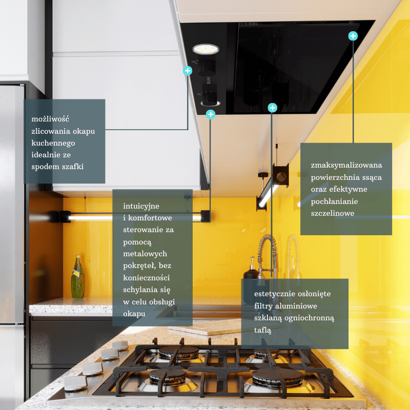 - Sterowanie: sterowanie za pomocą pokrętła umieszczonego na froncie okapu