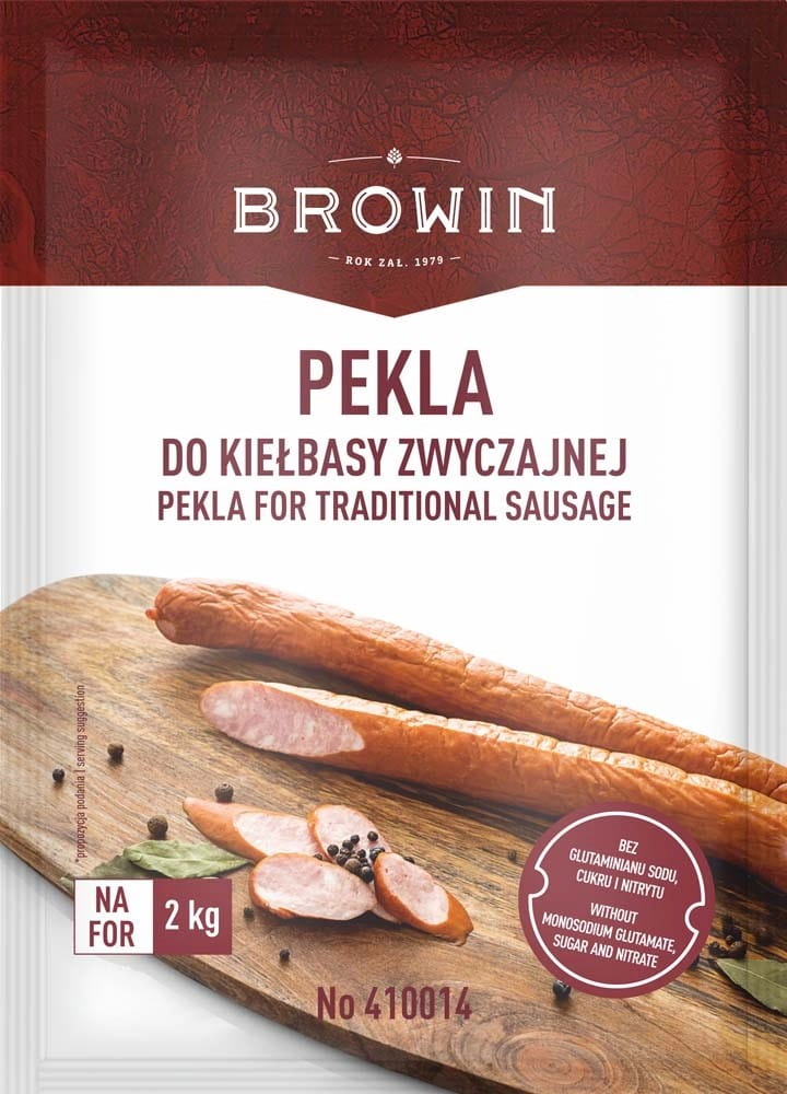Pekla do kiełbasy zwyczajnej z ziołami... bo domowe jest lepsze! Saletra z mieszanką ziół i przypraw idealnie sprawdzi się do przygotowania parzonych i wędzonych kiełbas. Dzięki peklowaniu mięso zachowa apetyczny kolor i będzie stabilne mikrobiologicznie. Zawarte w mieszance zioła i przyprawy zapewnią mu zaś doskonały smak i wyjątkowy aromat. Składniki: sól kamienna niejodowana - chlorek sodu (NaCl), mieszanka ziół i przypraw (czosnek granulowany, pieprz czarny, majeranek, gałka muszkatołowa, czerwona papryka ostra), azotan potasu (E252).