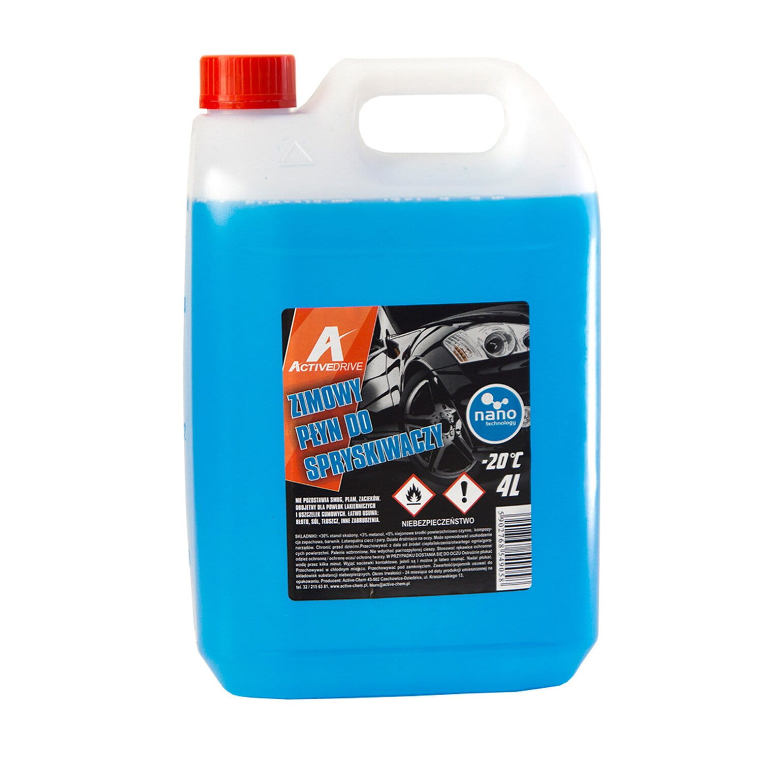 Zimowy płyn do spryskiwaczy o pojemności 4L, temperatura -20 stopni Celsjusza.