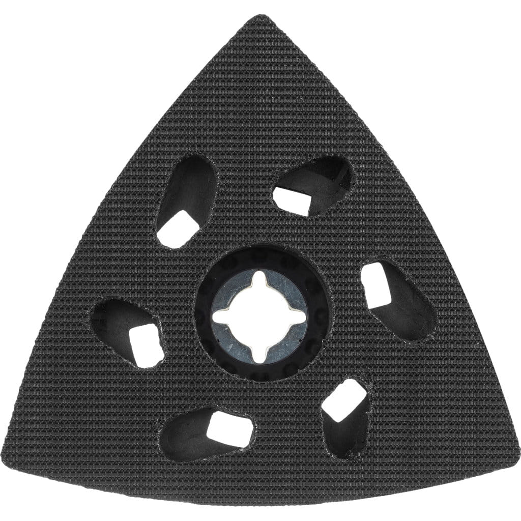 Mocowanie na rzep z welurem zapewnia sprawną wymianę papieru ściernego i umożliwia użytkowanie wielu różnych papierów ściernych o trójkątnym kształcie. Dzięki elastycznym rogom i zoptymalizowanej twardości płyta zapobiega stapianiu się weluru i papieru.