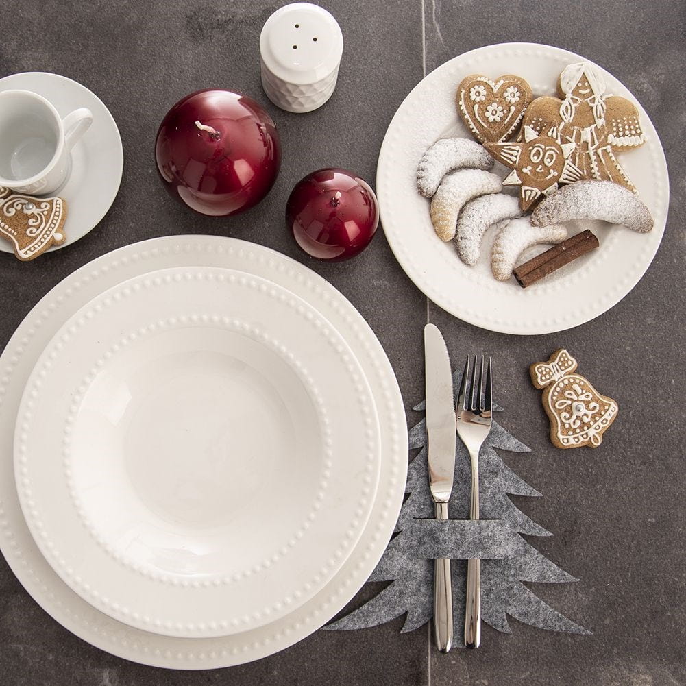 Świąteczne etui na sztućce wykonane z filcu w kolorze szarym. W zestawie znajdują się 2 sztuki etui w kształcie choinki. Oryginalna dekoracja na świąteczny stół.✅Dane techniczne: