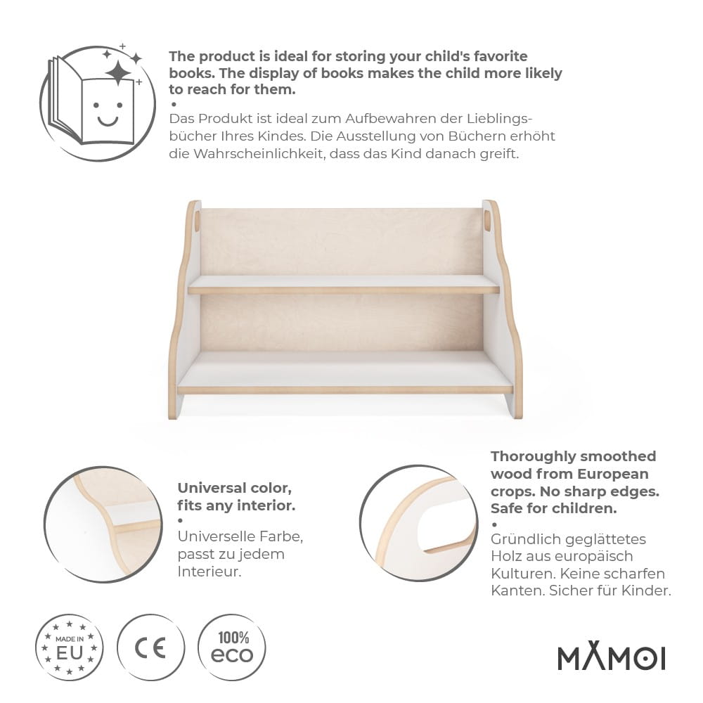 Regał dziecięcy jest przeznaczony do samodzielnego montażu zgodnie z załączoną instrukcją. Przed użyciem należy sprawdzić integralność pudełka na zabawki. Drewniane części można czyścić łagodnym detergentem i lekko wilgotną szmatką. Regał dziecięcy jest przeznaczony do użytku w pomieszczeniach. Należy go chronić przed niekorzystnymi warunkami pogodowymi. Producent nie ponosi odpowiedzialności za nieprzestrzeganie zasad przechowywania produktu.