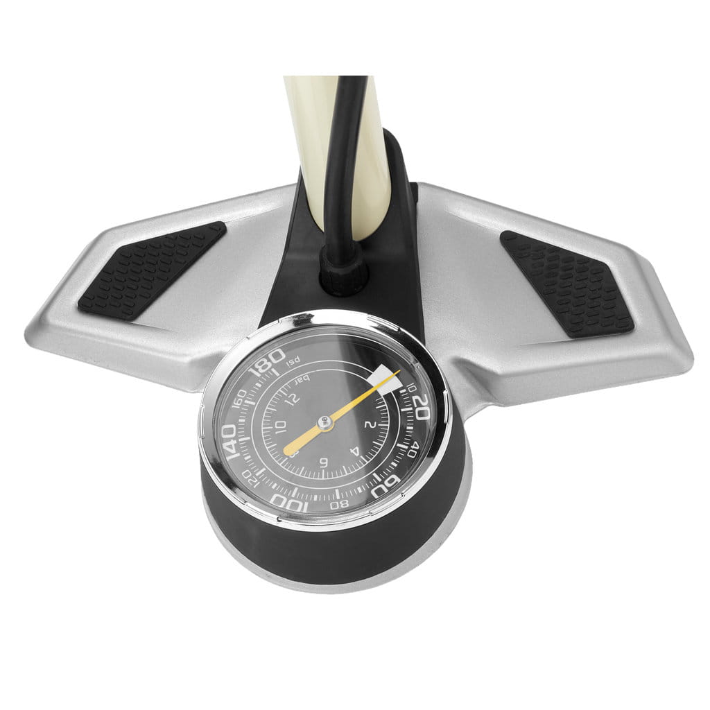 W podstawie pompki znajduje się czytelny, duży manometr z podziałką w barach/psi (12 barów/14 psi). Ciśnieniomierz umożliwia dostosowanie ciśnienia do zaleceń dla danej opony.