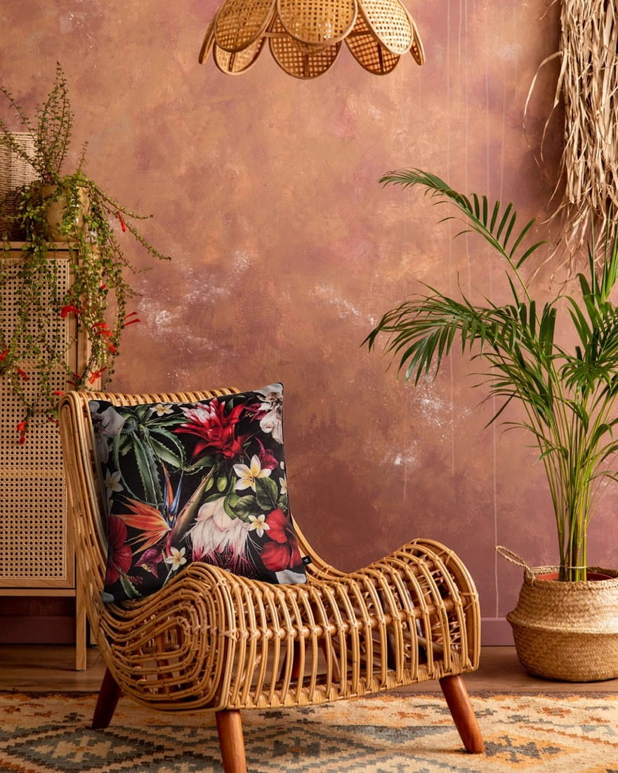 Welwetowa poszewka z nadrukiem roślinnym. Pasuje do wielu wnętrz, świetnie sprawdza się w tych loftowych, w towarzystwie drewna nabiera życia. Bogactwo i miękkość velvetu, który wciąż jest bardzo mocnym trendem w urządzaniu wnętrz, w połączeniu z głębią koloru pozwala uzyskać efekt wow. Materiał, z którego jest uszyta, jest bardzo łatwy w konserwacji. Zalecamy delikatne pranie i prasowanie na lewej stronie.