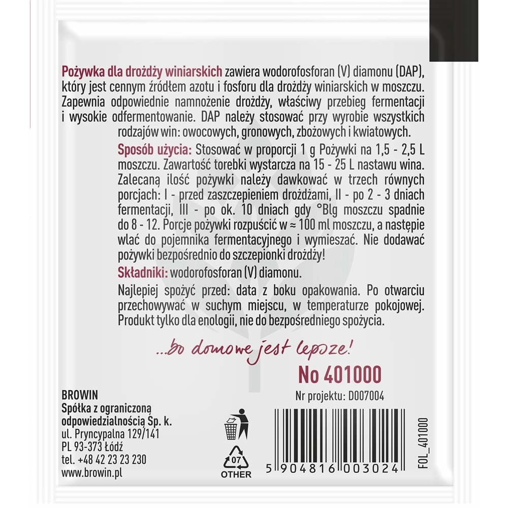 Pożywka mineralna, wykorzystywana do prawidłowego rozwoju drożdży.Pożywka posiada atest PZH, dopuszczający do kontaktu z produktami spożywczymi.