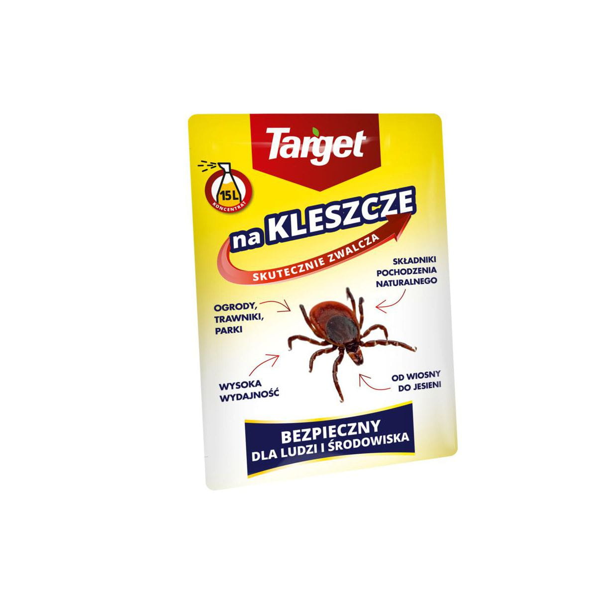 Target na kleszcze jest preparatem w formie koncentratu do sporządzania emulsji wodnej, o działaniu kontaktowym, przeznaczonym do stosowania na miejsca występowania kleszczy. Środek może być używany praktycznie wszędzie, gdzie kleszcze są problemem, a w szczególności w miejscach, gdzie stosowanie konwencjonalnych środków chemicznych, zawierających substancje aktywne, jest ograniczone bądź wręcz niemożliwe.