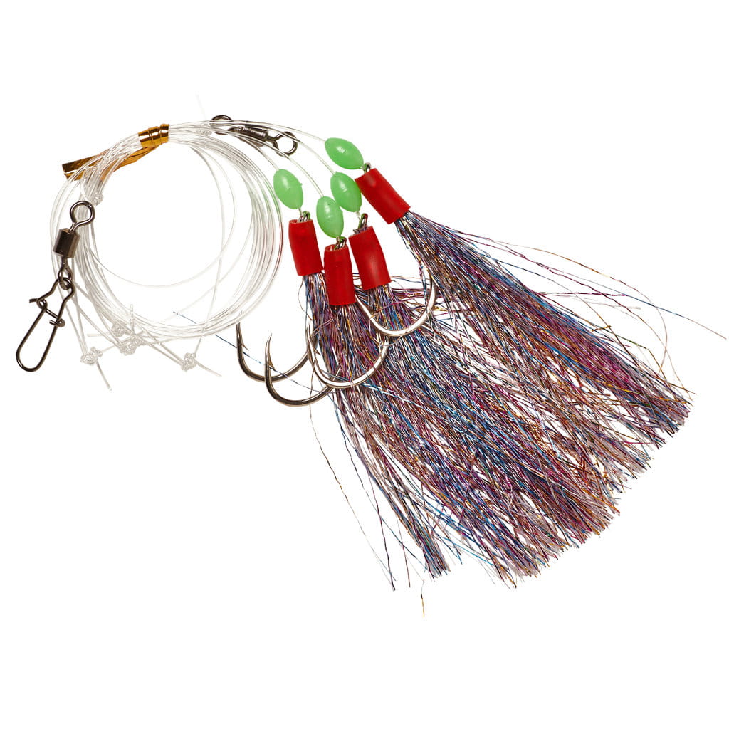 Przywieszka marki Kayoba z piórkami i fluorescencyjnymi przynętami to idealny wybór do morskiego połowu dorsza lub rdzawca i wielu innych gatunków ryb! Przywieszka składa się z nylonowej żyłki o długości 138 cm (Ø0,85 mm) oraz czterech przynęt imitujących robaki, wyposażonych w pojedyncze haczyki 4/0. Robaki są fluorescencyjne i dzięki temu lepiej widoczne dla ryb. Przynęty rozmieszczono w odstępach 35 cm na przyponach o długości 6 cm. Na obu końcach żyłki głównej znajdują się krętlik i karabińczyk.