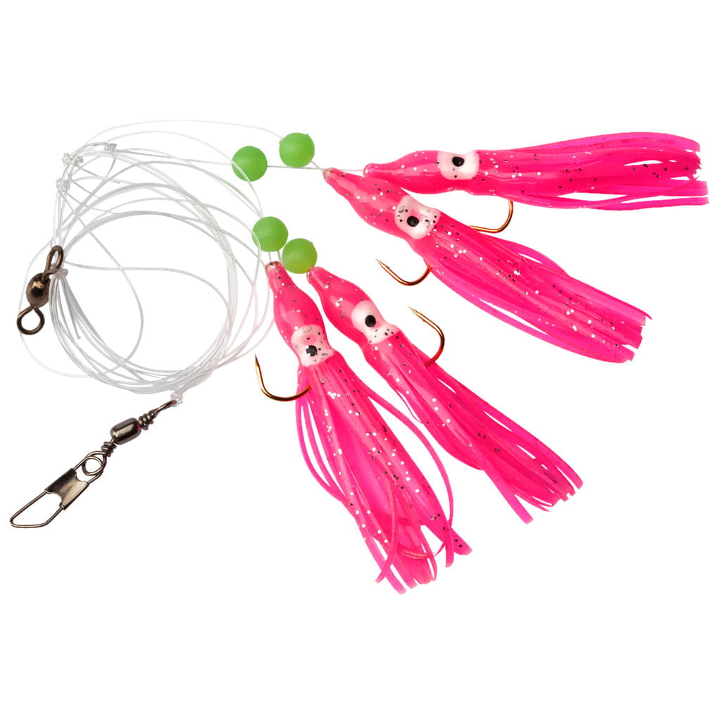 Przywieszka Kayoba z ośmiorniczkami doskonale sprawdza się między innymi podczas połowu dorszy i czarniaków. Przywieszka składa się z 110 cm żyłki z czterema haczykami, karabińczyka i krętlika.