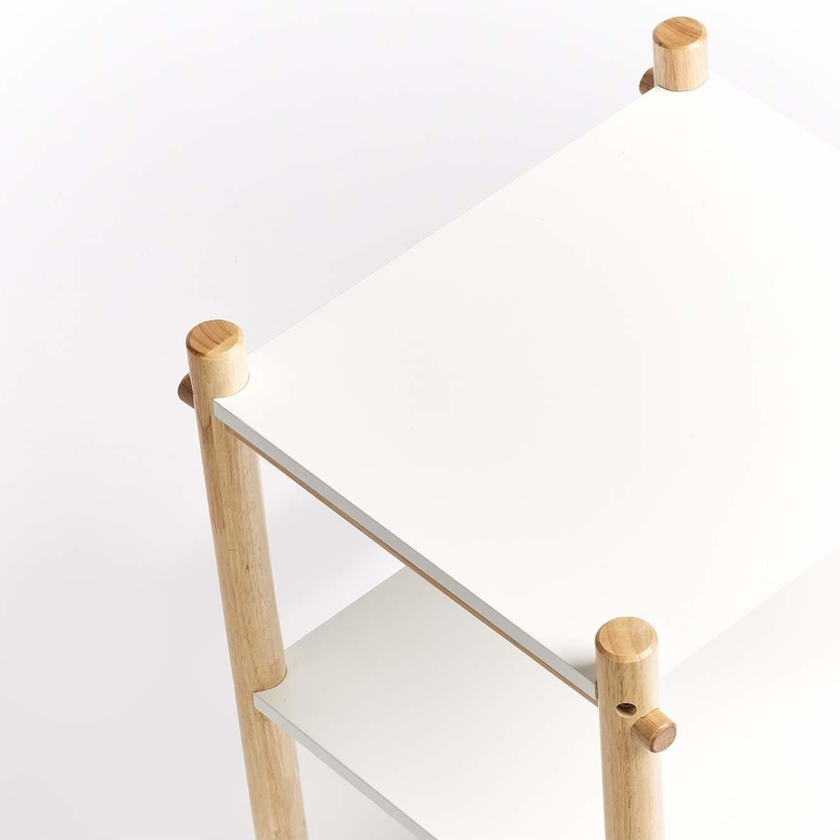 Biały kolor półek jest uniwersalny i pasuje do każdego stylu wnętrza, a drewniana konstrukcja dodaje ciepła i przytulności.