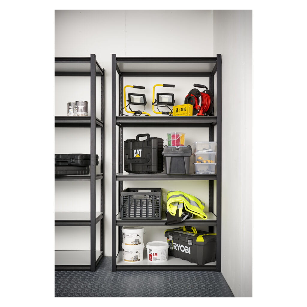 Stabilne i stylowe rozwiązanie magazynowe marki Hard Head! Solidna konstrukcja ze stali lakierowanej proszkowo wyposażona w pięć mocnych półek sprawia, że regał doskonale nadaje się do garażu, schowka, pralni czy domowego biura.
