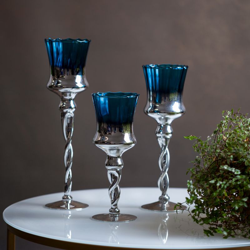 SZKLANY ŚWIECZNIK POJEDYŃCZY OZDOBNY 10X25 SREBRNY