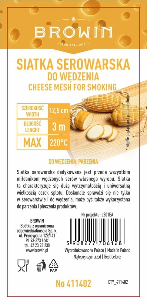 Niezastąpiona w kuchni, posłuży Ci podczas produkcji domowych serów, a także wędzenia, parzenia, pieczenia, suszenia i dojrzewania różnych rodzajów mięs.Siatka o uniwersalnym splocie - niezastąpiona wśród akcesoriów do produkcji domowych serów. Doskonale sprawdzi się nie tylko w serowarstwie i do wędzenia produktów, ale może być także wykorzystana do pieczenia (w temperaturze do 220 st.C, do 120 minut) oraz parzenia (w temperaturze do 125 st.C, do 120 minut). Niezwykle bezpieczna w użyciu - robiąc domowe sery masz pewność, że skrzep nie wydostanie się na zewnątrz. Użyty do produkcji siatki materiał nie wpływa na smak i zapach wyrobów.