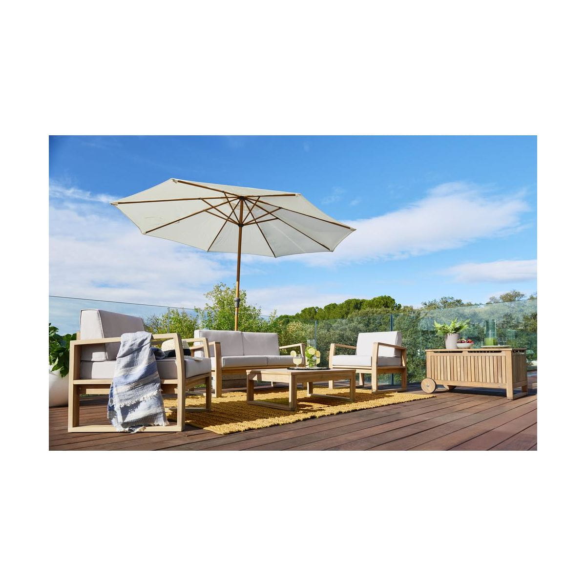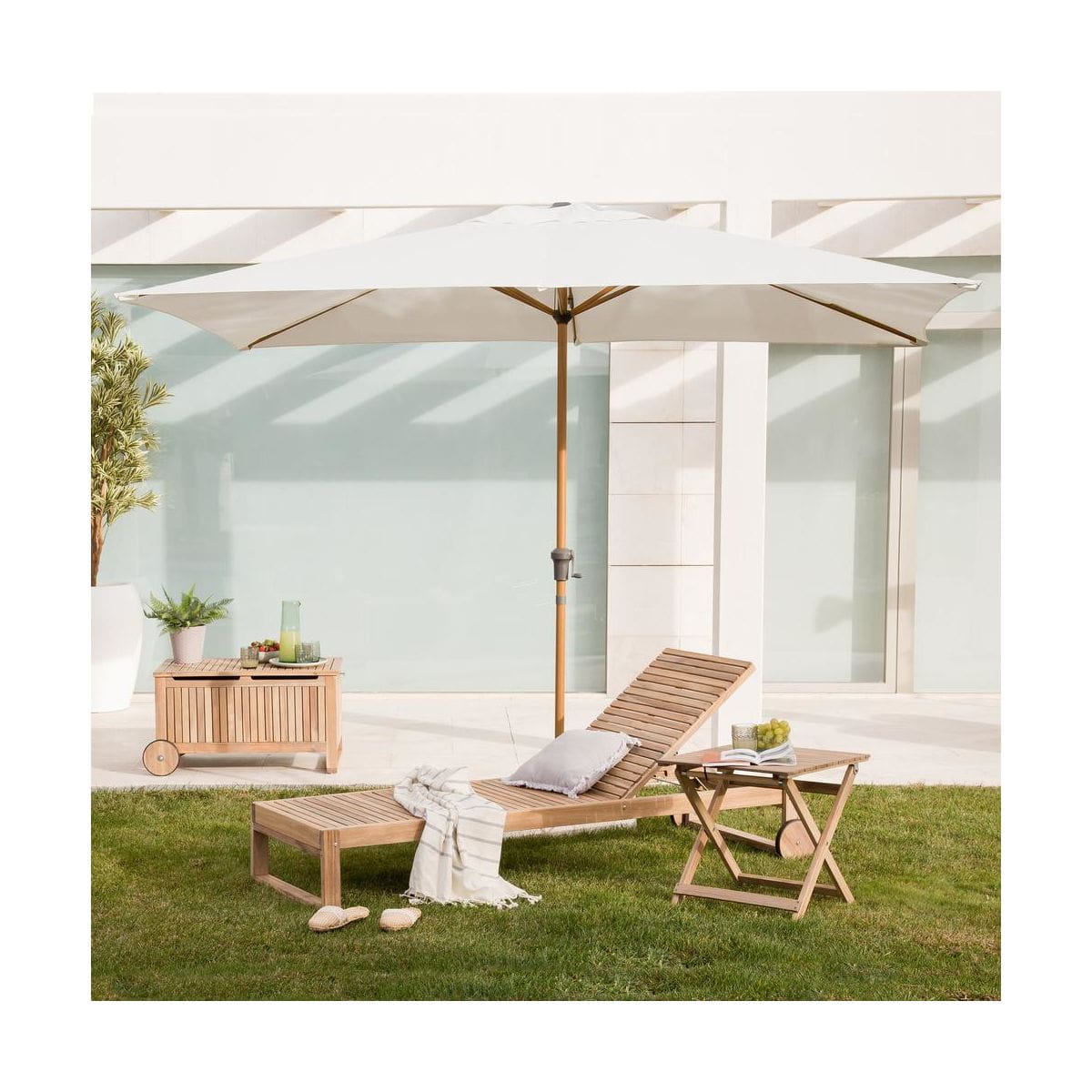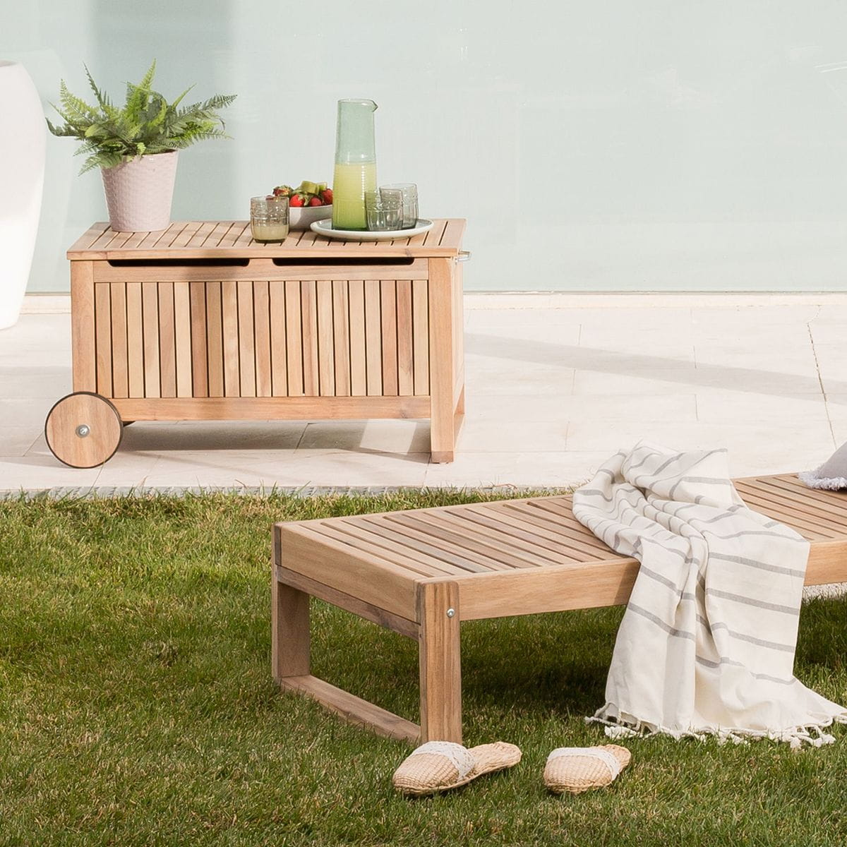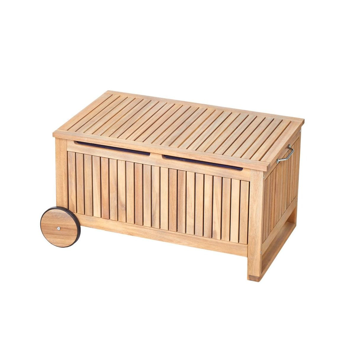 Skrzynia ogrodowa SOLIS NATERIAL to idealny produkt do przechowywania poduszek ogrodowych. Wyposażona w wewnętrzną osłonę z zamkiem błyskawicznym, aby lepiej chronić rzeczy zamknięte wewnątrz. W skrzyni przechowasz również zabawki dla dzieci, ubrania lub inne przedmioty w zależności od potrzeb. Kółka ułatwiają transport, nie musisz jej przenosić, co z wypełnioną skrzynią byłoby bardzo uciążliwie. Skrzynia może służyć również jako stolik do serwowania kawy lub barek, w którym schowasz napoje przed słońcem. Produkt odznacza się estetycznym wykonaniem z drewna akacjowego z certyfikatem FSC. Olej wykończeniowy zachowuje naturalny, lekko bielony wygląd drewna. Seria SOLIS / SOLARIS – to meble o uniwersalnej konstrukcji. Wpisują się w najnowsze trendy. Meble możesz dowolnie łączyć i tworzyć liczne aranżacje. W każdej chwili możesz dokupić mały stolik, składane krzesło lub leżak do wypoczynku na świeżym powietrzu.