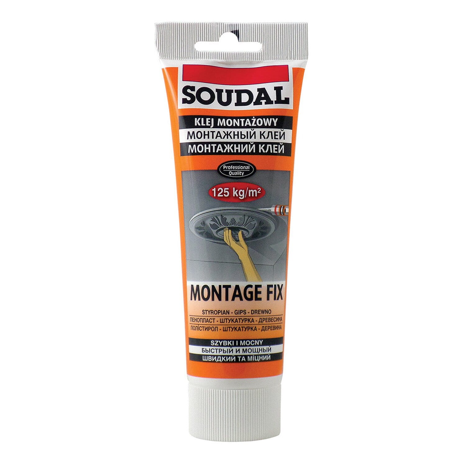Klej montażowy Montage FIXl firmy Soudal to gotowy do użycia klej na dyspersji wodnej. Sprawdzi się w klejeniu styropianowych paneli izolacyjnych i dekoracyjnych, elementów drewnianych (listwy, panele, uchwyty itp.) czy mocowaniu osłon kabli. Odznacza się doskonałą przyczepnością do porowatych podłoży budowlanych. Tworzy wodoodporną, wytrzymałą spoinę, którą można malować. Może być alternatywą dla nieestetycznych i kłopotliwych w montażu gwoździ i wkrętów. Charakteryzuje się wysoką siłą przyczepności początkowej (do 125kg/m2). Opakowanie 250 g.