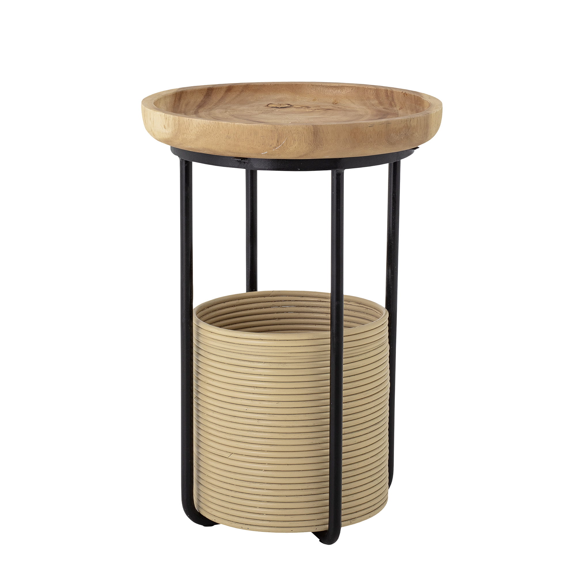 Stół boczny Hitti marki Bloomingville to połączenie drewna suar, rattanu i żelaza. Stół boczny ma mały okrągły blat i kosz pod blatem. To autentyczne piękno, które przyciągnie wszystkie spojrzenia.