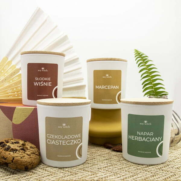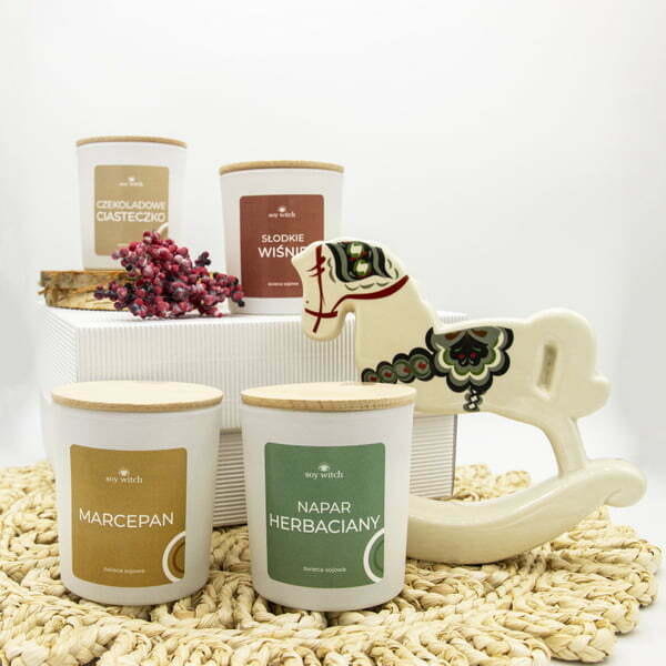 Aromaty ulubionych przysmakówNowa linia świec Spiżarnia Wiedźmy to odpowiedź na pragnienia wszystkich czarownic i czarowników, którzy kochają pyszne aromaty. Cztery słodkie, aromatyczne świece wykonaliśmy z wysokiej jakości wosku sojowego oraz certyfikowanych, wegańskich olejków. Posiadają one bawełniane knoty, a oprawione są w pojemniki z białego, matowego szkła z drewnianą pokrywką.Design dla nowoczesnych czarownic i czarowników Świeczki z zestawu Spiżarnia Wiedźmy wyróżniają się na tle naszych innych, magicznych produktów. Ich oprawy kojarzą się nam z pojemnikami na słodkie smakołyki. A Tobie?W skład zestawu wchodzą 4 sojowe świeczki o pojemności 205 ml zapakowane w białe pudełko.Napar herbaciany – przyniesie Ci ukojenie w jesienny i zimowy wieczór, Słodkie wiśnie – dzięki niej wspomnisz ostatnie dni gorącego lata i zatopisz się w słodyczy,Czekoladowe ciasteczko – wypełni Twój dom aromatem słodkich wypieków, Marcepan – przywiedzie na myśl świąteczne skojarzenia. Zamów zestaw już teraz i rozkoszuj się aromatami ze Spiżarni Wiedźmy!