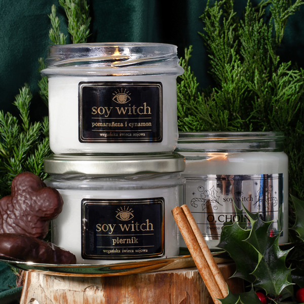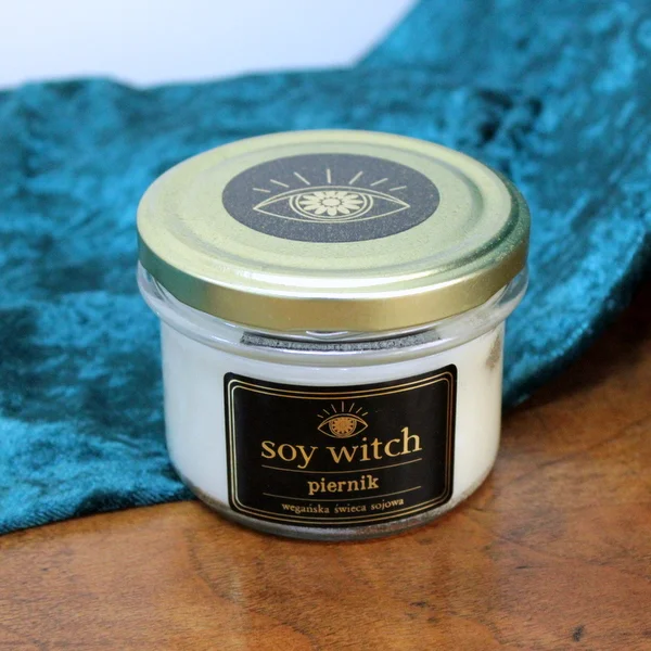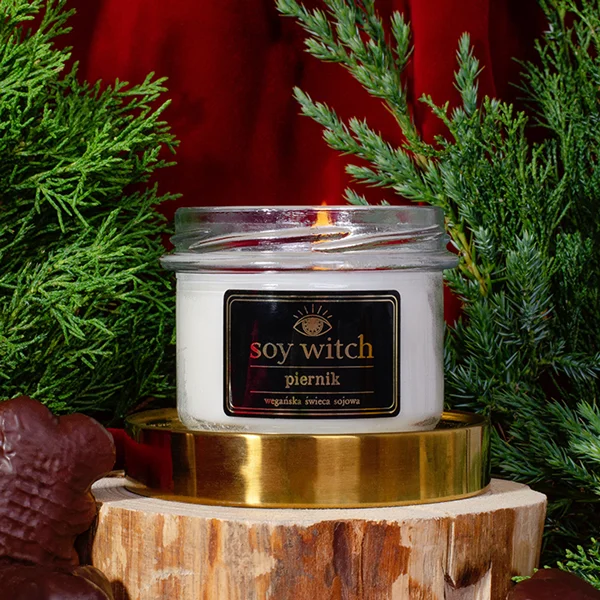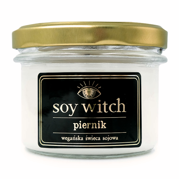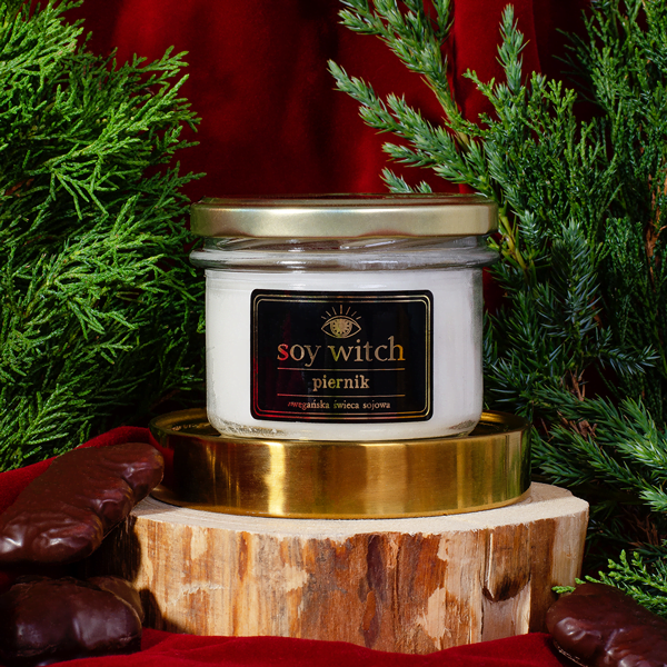 Ktoś wyjął świeżo upieczone pierniki z piekarnika? Nie, to po prostu świeczka sojowa od Soy Witch o zapachu piernika! Ten świąteczny zapach postanowiliśmy zamknąć w wyjątkowej oprawie. Ma metaliczną, złotą etykietę oraz połyskujące oko Soy Witch na wieczku. Będzie ona zatem nie tylko uwodzić zapachem, ale i czarować oczy! Świąteczna świeczka o zapachu piernika – nie tylko na prezentTa aromatyczna świeczka w świątecznym wydaniu będzie świetnym pomysłem na prezent, ale może być też uzupełnieniem świątecznych dekoracji Twojego domu! Możesz postawić świeczkę Soy Witch przy kompozycji z gałązek choinki czy też w otoczeniu świecących ozdób. Stwórz świąteczną atmosferę razem z sojową czarownicą.Intensywne aromatyW Soy Witch ważne jest dla nas, aby zapachy świec były delikatne, stonowane i odpowiednie dla osób z migrenami. Jednak świąteczne świeczki rządzą się swoimi prawami! Dlatego zarówno Piernik, jak i Pomarańcza i cynamon – mają w sobie prawdziwą, świąteczną moc zapachu. Jeśli szukasz czegoś delikatniejszego – polecamy świecę rzepakową O, choinka!