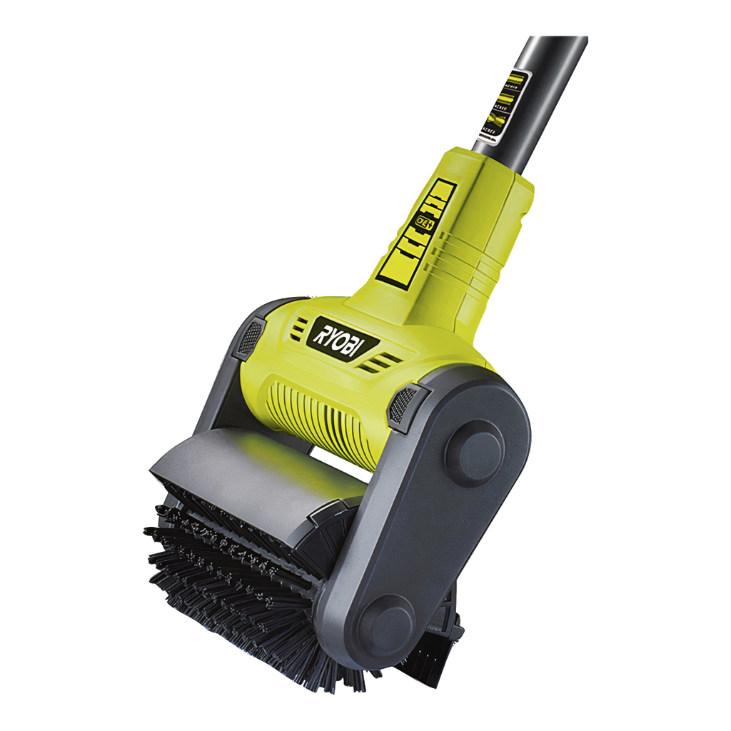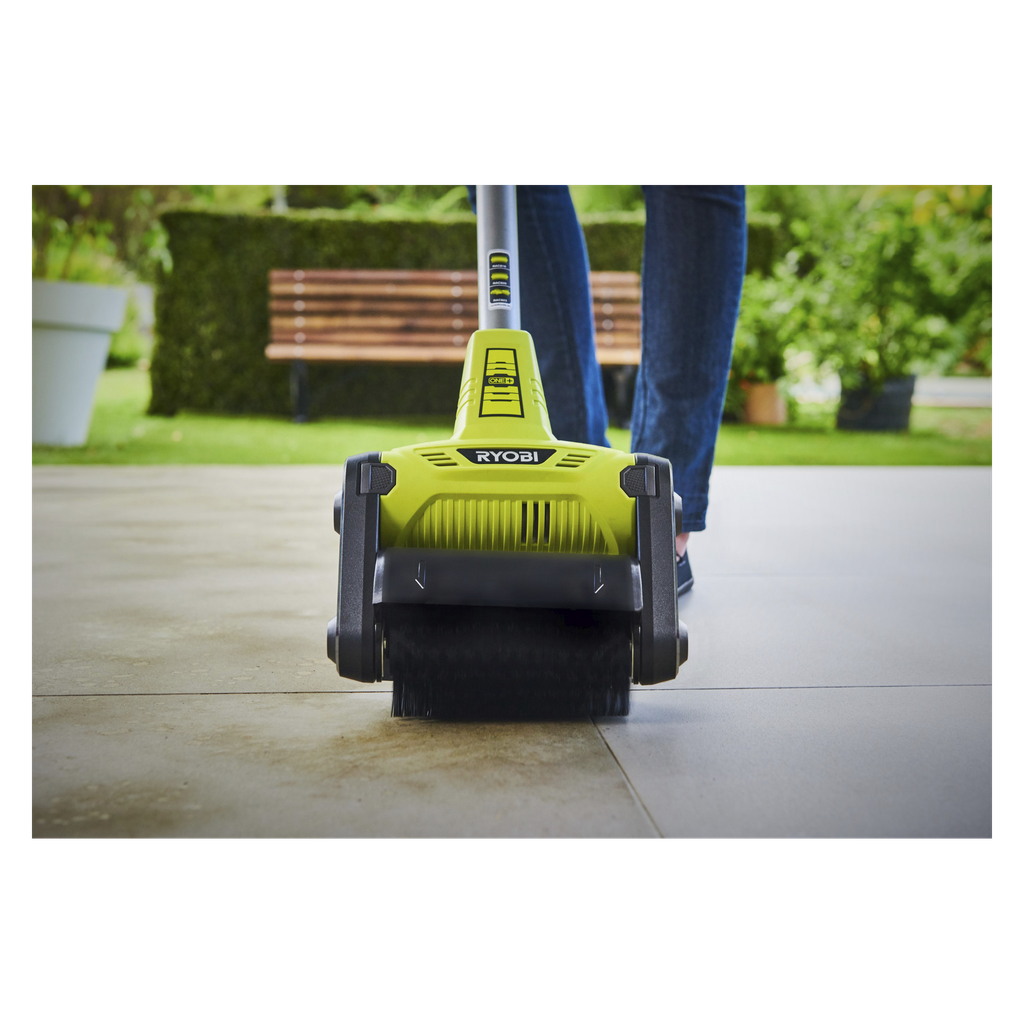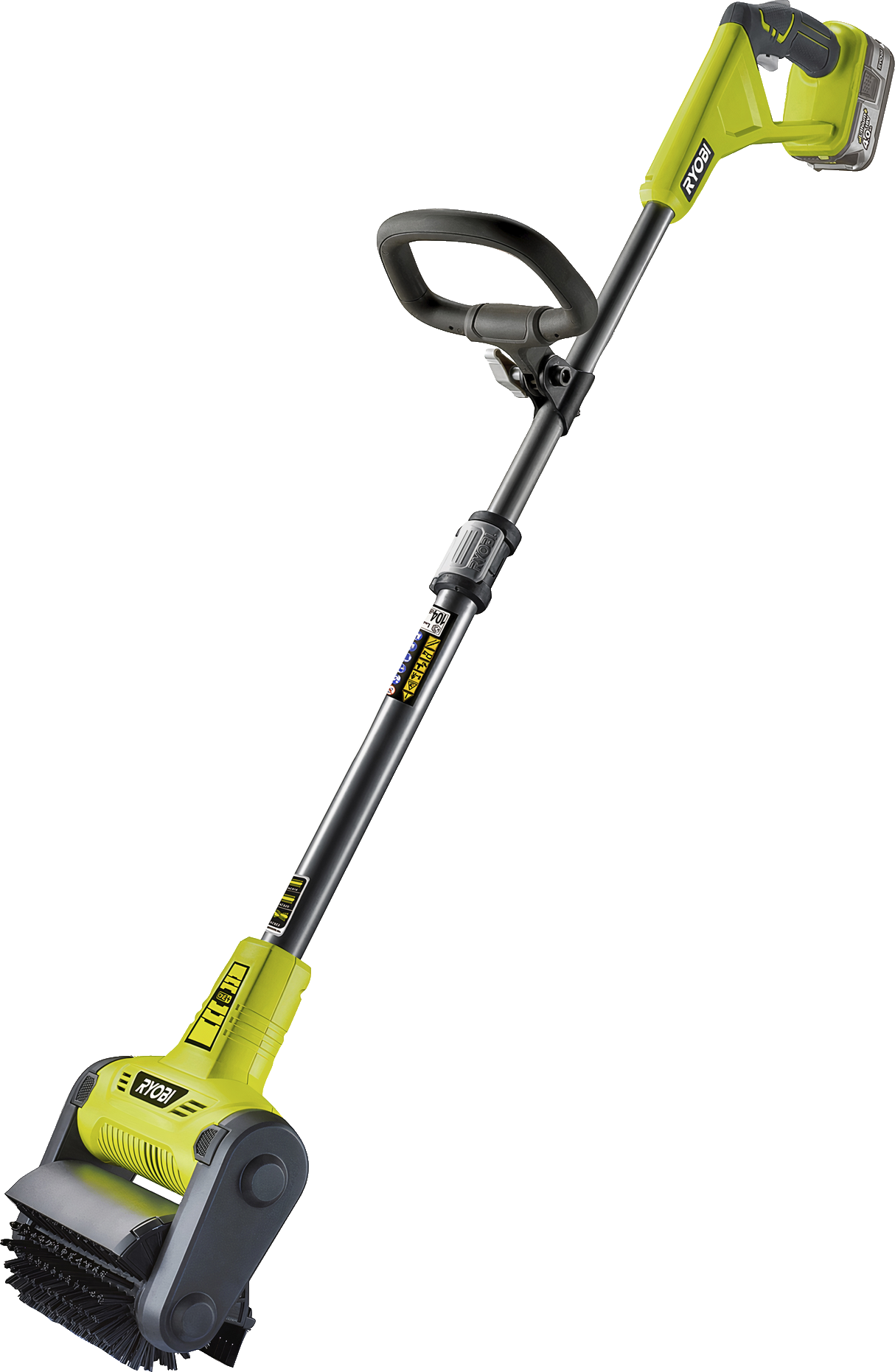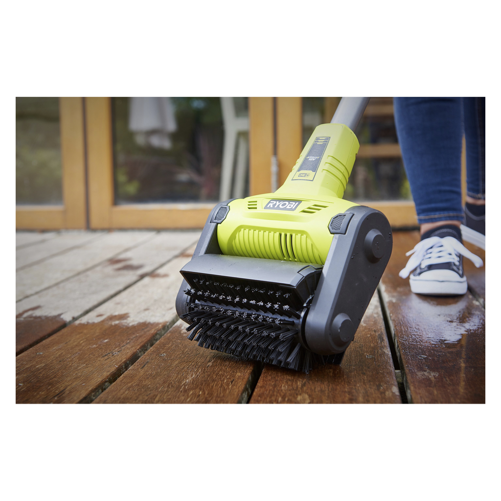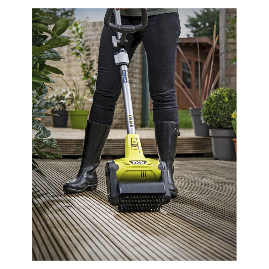 Model RY18PCB-0 marki Ryobi czyści twarde powierzchnie na zewnątrz, np. drewniany taras, altanę czy podjazd z kostki brukowej.
